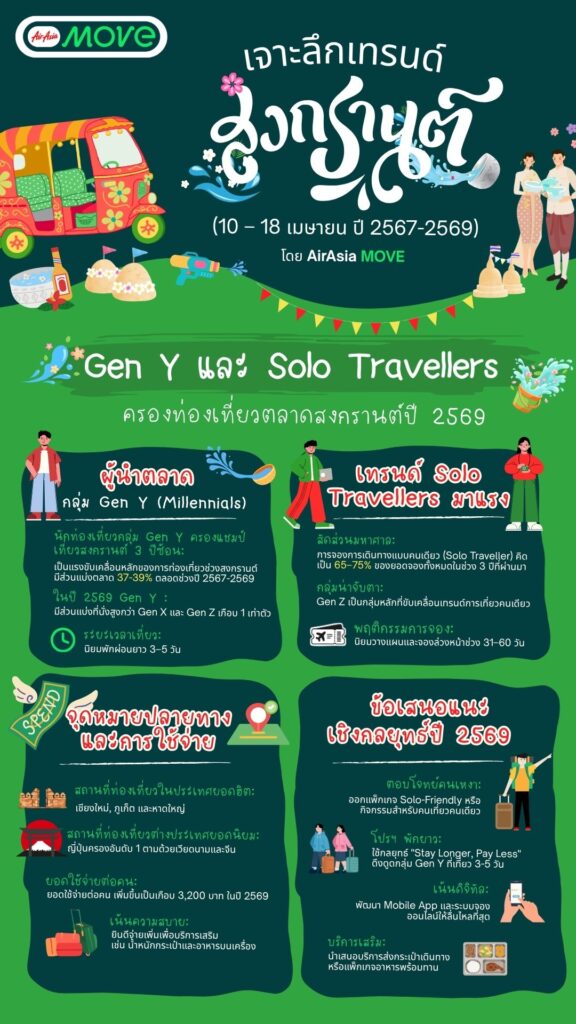 AirAsia MOVE เผยข้อมูลนักท่องเที่ยวช่วง “สงกรานต์ 3 ปีซ้อน” เจาะลึก Insight คนไทย Gen Y และ Solo Traveller แชมป์เที่ยว กิน-นอนยาวรับปี 2569