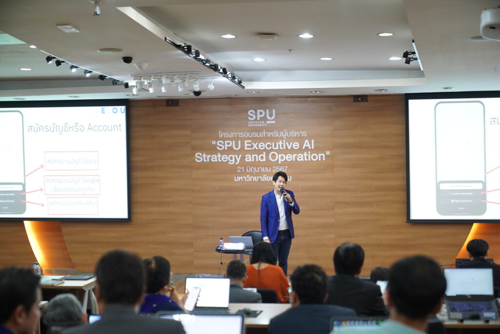 2. การฝึกใช้ Generative AI ในงานประจำวัน Smart Work Smart Life with AI Helper สำหรับบุคลากรระดับปฏิบัติการเข้าร่วมในเฟสแรกจำนวน 60 คนจากทุกแผนก เรียนต่อเนื่อง 19 วัน แบ่งเป็น Work Shop เรียนร่วมกัน 3 วัน เพื่อเปิดโอกาสให้เรียนรู้ได้อย่างเต็มที่ แบบจับมือทำเพื่อแลกเปลี่ยน แบ่งปันกันระหว่างผู้เข้าร่วม หลังจากนั้นส่งการบ้านทางออนไลน์ และมีการจัดประกวดเพื่อจูงใจให้เกิด “การเรียนรู้ได้อย่างเต็มที่ โดยบุคลากร SPU ทุกคนที่ผ่านการเรียนรู้จะต้องรู้จักการประยุกต์ใช้ AI เป็นนิสัย หรือ Helper ในการทำงาน เป็นผู้ช่วยในงานที่ไม่ถนัด และเป็นเพื่อนคู่คิดในงานที่ชำนาญ ให้ประสิทธิผลของานดียิ่งขึ้น และมีแผนพัฒนาบุคลากรปฏิบัติการ ต่อเนื่องรุ่นละ 60 คน