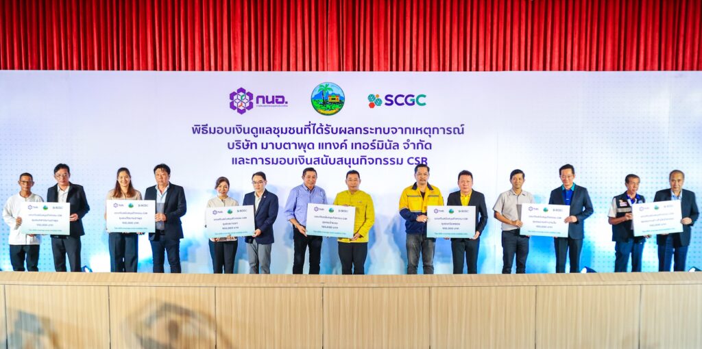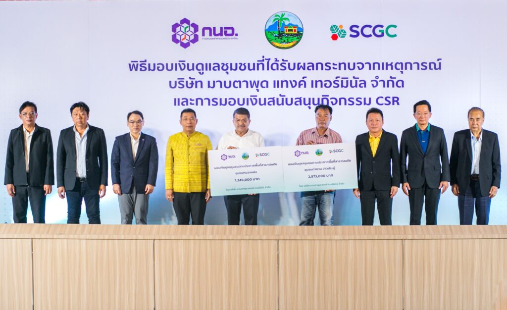 จังหวัดระยอง การนิคมอุตสาหกรรมแห่งประเทศไทย ร่วมกับบริษัท เอสซีจี เคมิคอลส์ จำกัด (มหาชน) หรือ เอสซีจีซี (SCGC) และ บริษัท มาบตาพุด แทงค์ เทอร์มินัล จำกัด ในกลุ่มธุรกิจ SCGC จัดพิธีมอบเงินดูแลชุมชนที่ได้รับผลกระทบจากเหตุการณ์ บริษัท มาบตาพุด แทงค์ เทอร์มินัล จำกัด พร้อมมอบเงินสนับสนุนกิจกรรม CSR เพื่อให้ชุมชนนำไปทำกิจกรรมสาธารณประโยชน์เพื่อส่วนรวม โดยมี นายไตรภพ วงศ์ไตรรัตน์ ผู้ว่าราชการจังหวัดระยอง เป็นประธานในพิธี ร่วมด้วยนายปมุข เตพละกุล ผู้ช่วยผู้ว่าการ การนิคมอุตสาหกรรมแห่งประเทศไทย นายศักดิ์ชัย ปฏิภาณปรีชาวุฒิ ประธานเจ้าหน้าที่บริหารและกรรมการผู้จัดการใหญ่ SCGC นายมงคล เฮงโรจนโสภณ ประธานเจ้าหน้าที่สายงานปฏิบัติการ SCGC นายถวิล โพธิบัวทอง นายกเทศมนตรีเมืองมาบตาพุด นายสุชิน พูลหิรัญ นายกเทศมนตรีตำบลบ้านฉาง นายสันติ บุษบาศรี รองนายกเทศมนตรีตำบลมาบข่าพัฒนา พร้อมด้วยตัวแทนชุมชนกว่า 80 ชุมชน ร่วมในพิธี ณ หอประชุมศูนย์ราชการจังหวัดระยอง