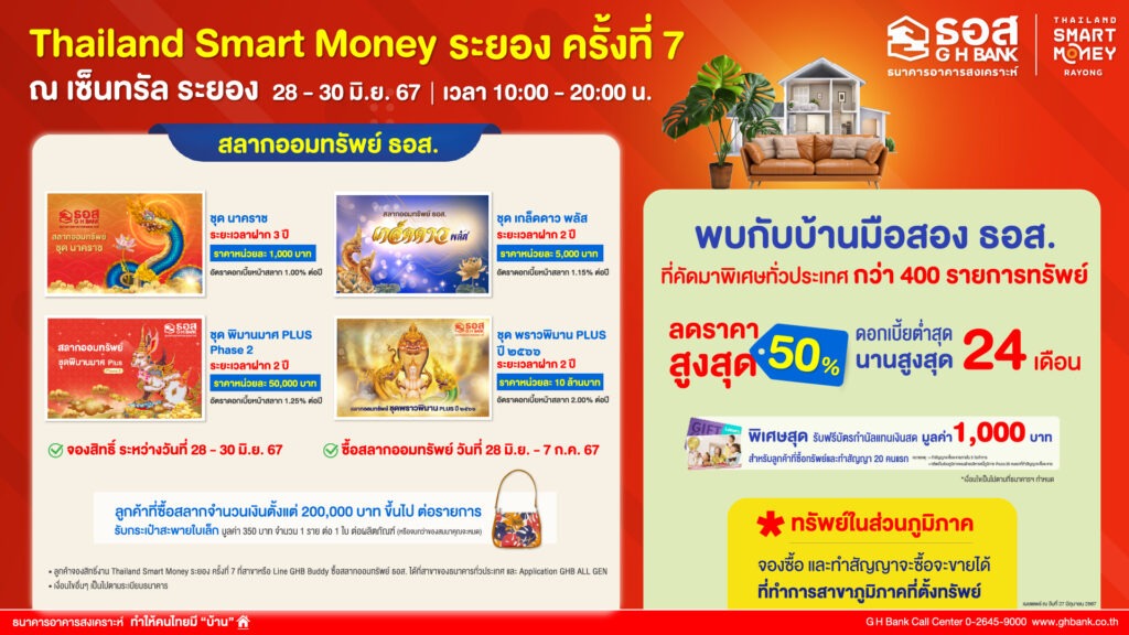 ทั้งนี้ ลูกค้าที่ใช้บริการผลิตภัณฑ์การเงินของ ธอส. ตามเงื่อนไขและระยะเวลาที่ธนาคารกำหนด จะได้รับของที่ระลึกฟรี อีกมากมาย โดยงาน Thailand Smart Money ระยอง ครั้งที่ 7 มีกำหนดจัดขึ้นระหว่างวันที่ 28-30 มิถุนายน 2567ณ เซ็นทรัล ระยอง โดยสอบถามรายละเอียดเพิ่มเติมได้ที่ ธอส.ทุกสาขาทั่วประเทศ G H Bank Call Center โทร.0-2645-9000 หรือ Facebook Fanpage ธนาคารอาคารสงเคราะห์ และติดตามข่าวสารของธนาคารได้ที่ Application : GHB ALL GEN และ www.ghbank.co.th