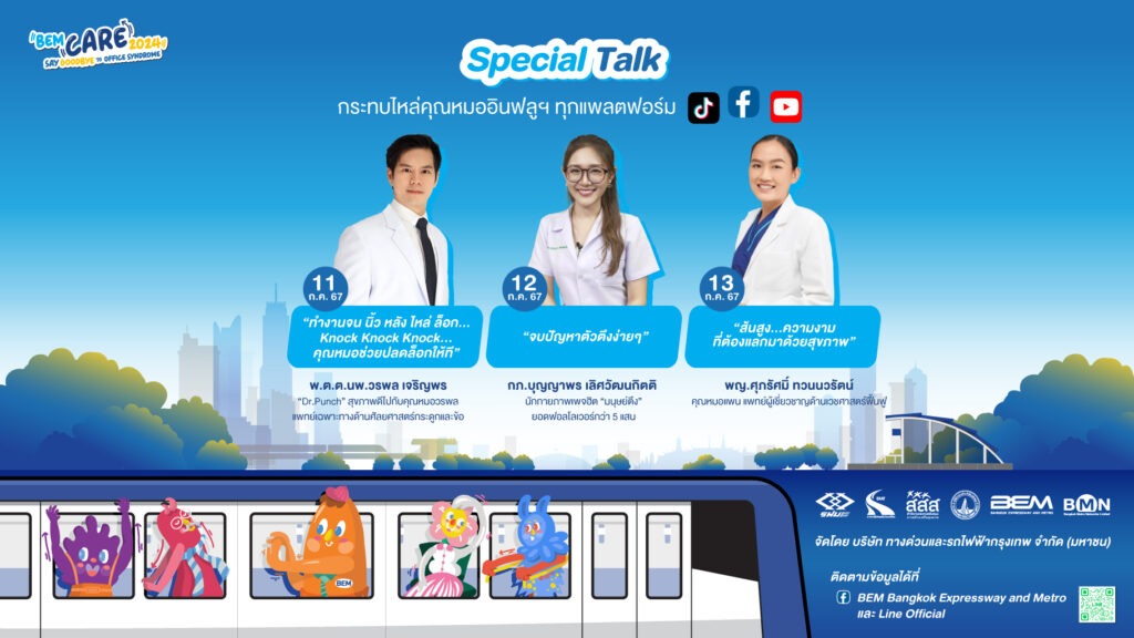 ห้ามพลาด!! BEM CARE 2024…Say Goodbye to Office Syndrome วันที่ 11-13 กรกฎาคม 2567 ตั้งแต่เวลา 10.00-20.00 น. ณ สถานีรถไฟฟ้า MRT สวนจตุจักร ชั้นร้านค้าทางออก 2 และ 3 ติดตามรายละเอียดได้ทาง Facebook (เฟซบุ๊ก) และ X (เอ็กซ์): BEM Bangkok Expressway and Metro