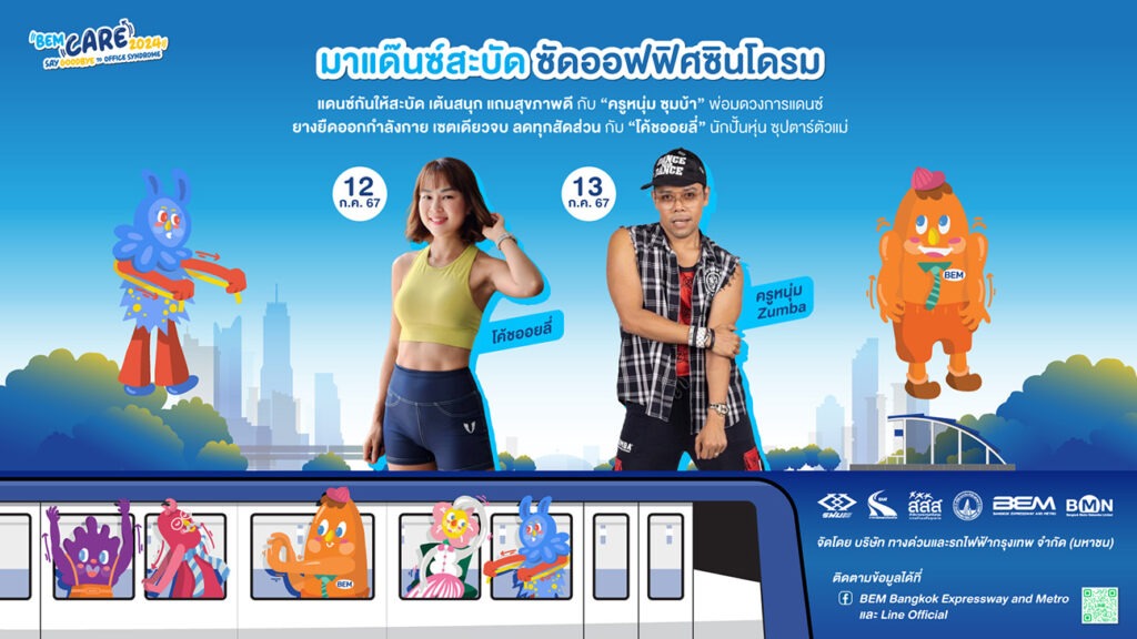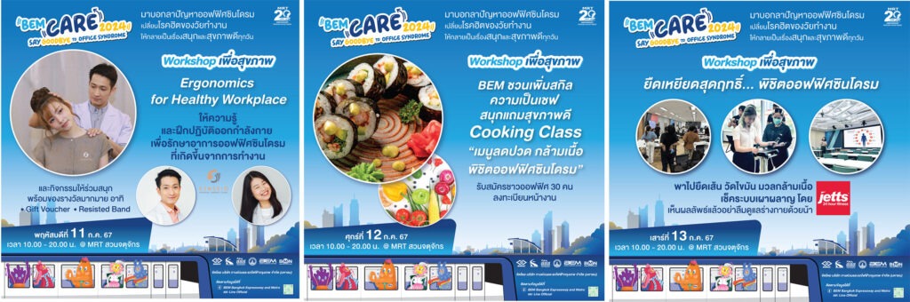จัดงาน BEM CARE 2024…Say Goodbye to Office Syndrome (เบม แคร์ 2024…เซย์ กู้ดบาย ทู ออฟฟิศ ซินโดรม) วันที่ 11-13 กรกฎาคม 2567 ตั้งแต่เวลา 10.00-20.00 น. ณ สถานีรถไฟฟ้า MRT สวนจตุจักร งานแฟร์เพื่อสุขภาพ ที่จะเปลี่ยนโรคฮิตของวัยทำงานให้กลายเป็นเรื่องสนุกและสุขภาพดีในทุกๆ วัน รวบรวมสาระความรู้ ตอบปัญหาทุกคำถาม อาหารเพื่อสุขภาพ ท่ากายบริหาร สุดมันส์ และกิจกรรมอีกมากมาย