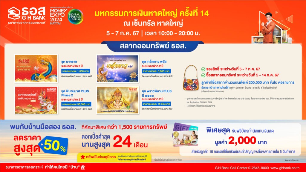 ทั้งนี้ ลูกค้าที่ใช้บริการผลิตภัณฑ์การเงินของธอส. ตามเงื่อนไขและระยะเวลาที่ธนาคารกำหนด จะได้รับของที่ระลึกฟรี อีกมากมาย โดยมหกรรมการเงินหาดใหญ่ ครั้งที่ 14 มีกำหนดจัดขึ้นระหว่างวันที่ 5 – 7 กรกฎาคม 2567 ณ เซ็นทรัล หาดใหญ่ โดยสอบถามรายละเอียดเพิ่มเติมได้ที่ ธอส.ทุกสาขาทั่วประเทศ G H Bank Call Center โทร.0-2645-9000 หรือ Facebook Fanpage ธนาคารอาคารสงเคราะห์ และติดตามข่าวสารของธนาคารได้ที่ Application : GHB ALL GEN และ www.ghbank.co.th