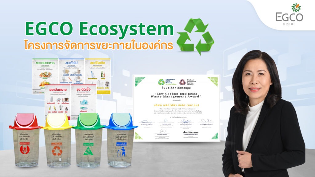 นอกจากนี้ โครงการ “EGCO Ecosystem” ยังได้รับการยอมรับทั้งในระดับประเทศและภูมิภาค โดยได้รับใบประกาศเกียรติคุณ “Low Carbon Business: Waste Management Award” จากโครงการ “ถนนวิภาวดีฯ ไม่มีขยะ” ในปี 2564 และรางวัล “Asia Responsible Enterprise Awards 2022” สาขา Green Leadership จากสถาบัน Enterprise Asia ในปี 2565 นอกจากนี้ EGCO Group ได้ขยายผลสำเร็จของโครงการฯ สู่ชุมชนและสังคมภายนอก ด้วยการสนับสนุน     ถังขยะแยกประเภทและแบ่งปันองค์ความรู้ด้านการจัดการขยะแก่วัดและโรงเรียนอีกด้วย