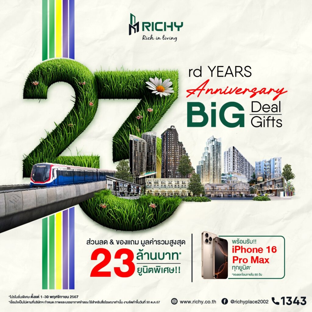 ในโอกาสฉลองครบรอบ 23 ปี บริษัทฯ จึงออกแบบโปรโมชั่นสุดพิเศษ “Richy 23rd Anniversary: Big Deals, Big Gifts!” ภายใต้ Concept “Up Your Life, Up Your Connect” รับส่วนลดและของแถมมูลค่ารวมสูงสุด 23 ล้านบาท เพียงจองโครงการในเครือทั้ง 23 โครงการ ราคาเริ่ม 2.39 – 19.5 ล้านบาท รับทันที iPhone 16 pro max (เงื่อนไข : จองและโอนภายใน 30 วัน) พร้อมรับส่วนลด 23 เท่า (สูงสุด 2.3 ล้านบาท*) ผ่อนล้านละ 3,000 บาท อัตราดอกเบี้ย 1.59% ต่อปี แถมฟรีค่าใช้จ่ายวันโอน