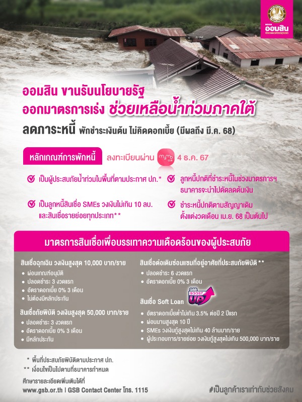 ออมสิน ขานรับนโยบายรัฐ เร่งช่วยเหลือพื้นที่น้ำท่วมภาคใต้ มอบมาตรการบรรเทาความเดือดร้อน พักหนี้-ไม่คิดดอกเบี้ยถึง มี.ค. 68 ปล่อยกู้ฉุกเฉินดอกเบี้ย 0% 3 เดือน พร้อมช่วยเหลือเฉพาะหน้าและหลังน้ำลด