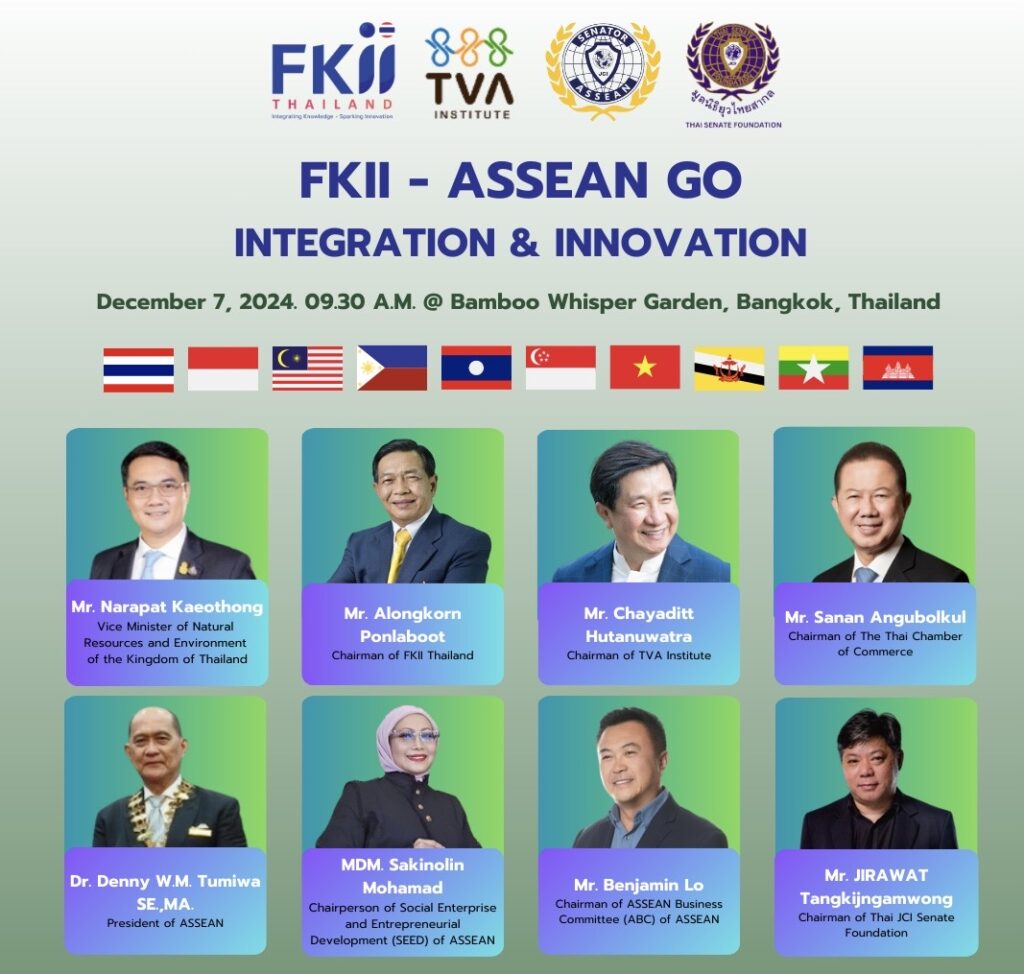 นายชยดิฐ หุตานุวัชร์ ประธานสถาบันทิวา (TVA Institute) และผู้อำนวยการ FKII Thailand กำหนดจัดงาน “FKII – ASSEAN GO : INTEGRATION & INNOVATION” ในวันที่ 7 ธันวาคม 2567 เวลา 9.30 – 13.30 น. ณ สวนเสียงไผ่ สถาบันทิวา ทาวน์อินทาวน์ กรุงเทพมหานคร โดยงานดังกล่าวเป็นโครงการความร่วมมือระหว่าง5ภาคีไทย-อาเซียนได้แก่ FKII Thailand สถาบันทิวา (TVA Institute) องค์การสมาชิกสภาอาวุโสเจซีไอแห่งอาเซียน (Senator JCI ASSEAN) องค์การพัฒนาวิสาหกิจเพื่อสังคมและการประกอบการ (SEED) และมูลนิธิยุวไทยสากล (Thai Senate JCI Foundation)