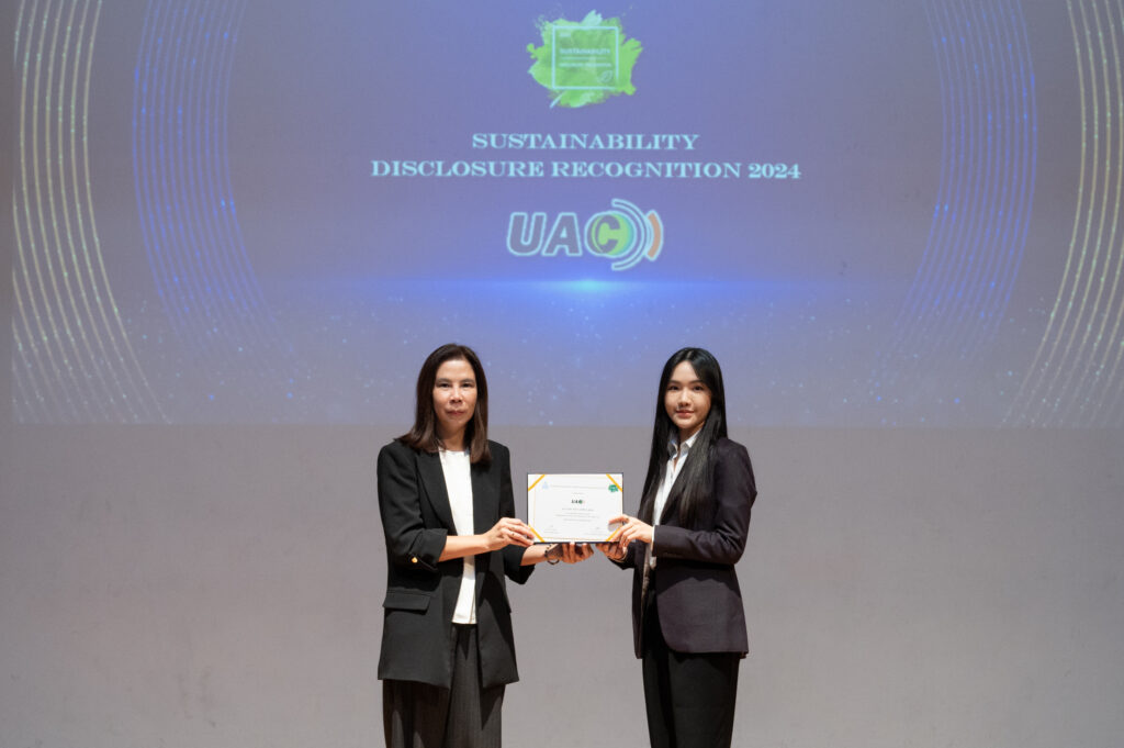 นางสาวอลิสา ชีวะเกตุ General Manager – Strategic Investment บริษัท ยูเอซี โกลบอล จำกัด (มหาชน) หรือ “UAC” เข้ารับรางวัลประกาศเกียรติคุณ “Sustainability Disclosure Recognition” หรือ รางวัลการเปิดเผยข้อมูลความยั่งยืนประจำปี 2567 ต่อเนื่องเป็นปีที่ 4 โดยมีนางสาววีรญา ปรียาพันธ์ ผู้อำนวยการ ประชาคมการเปิดเผยข้อมูลความยั่งยืน (SDC) จากสถาบันไทยพัฒน์ เป็นผู้มอบรางวัลในครั้ง ซึ่งสะท้อนให้เห็นว่า UAC มีการดำเนินธุรกิจโดยให้ความสำคัญต่อผู้มีส่วนได้เสียทุกฝ่ายโดยยึดหลักความยั่งยืนทั้งในด้านสิ่งแวดล้อม สังคม และการกำกับดูแลกิจการ (Environmental, Social, and Governance: ESG) ตามแนวทางการวางรากฐานความยั่งยืนและมั่นคง เพื่อสร้างผลตอบแทนให้กับบริษัทฯ ในระยะยาว ตอกย้ำถึงการขับเคลื่อนองค์กรสู่การเป็นผู้นำธุรกิจในรูปแบบเศรษฐกิจหมุนเวียน (Circular Economy) ณ ห้องออดิทอเรียม ชั้น 5 หอศิลปวัฒนธรรมแห่งกรุงเทพมหานคร