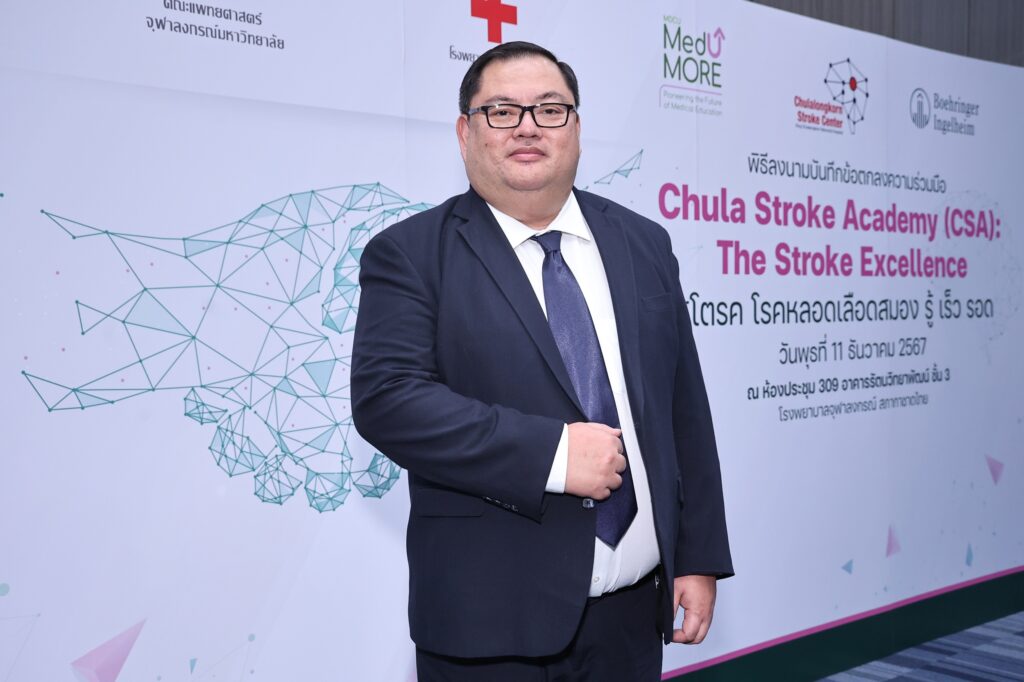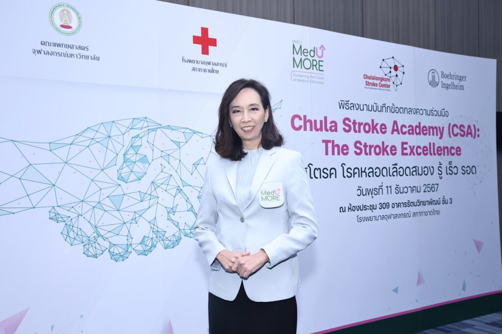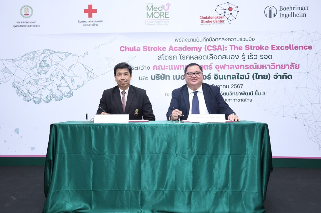 บริษัท เบอริงเกอร์ อินเกลไฮม์ (ไทย) จำกัด ลงนามในบันทึกข้อตกลงความร่วมมือกับ คณะแพทยศาสตร์ จุฬาลงกรณ์มหาวิทยาลัย ในโครงการ ‘Chula Stroke Academy: The Stroke Excellence สโตรค โรคหลอดเลือดสมอง รู้ เร็ว รอด’ โดยมีวัตถุประสงค์ในการยกระดับคุณภาพการดูแลและรักษาโรคหลอดเลือดสมองผ่านการส่งเสริมการแบ่งปันองค์ความรู้โรคหลอดเลือดสมองผ่าน MDCU MedUMORE แพลตฟอร์มคลังความรู้แพทย์ออนไลน์ (E-Learning Platform) ที่ครอบคลุมการดูแลรักษาโรคหลอดเลือดสมองในทุกมิติทั้ง การรักษาแบบการให้ยาละลายลิ่มเลือด (Thrombolytic Management) การทำหัตถการผ่านสายสวนหลอดเลือดสมอง (Endovascular Thrombectomy) ฯลฯ รวมไปถึงการเพิ่มการเข้าถึงแพลตฟอร์มในกลุ่มบุคลากรทางการแพทย์ โดยงานลงนามบันทึกข้อตกลงความร่วมมือในครั้งนี้ ได้จัดขึ้นในวันที่ 11 ธันวาคม 2567 ณ อาคารรัตนวิทยาพัฒน์ โรงพยาบาลจุฬาลงกรณ์ สภากาชาดไทย