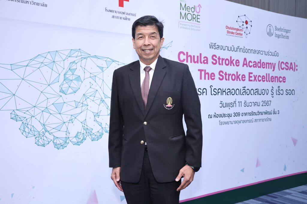รศ.นพ.ฉันชาย สิทธิพันธุ์ คณบดีคณะแพทยศาสตร์ จุฬาลงกรณ์มหาวิทยาลัย กล่าวว่า “คณะแพทยศาสตร์ จุฬาลงกรณ์มหาวิทยลัย มุ่งมั่นที่จะเป็นสถาบันต้นแบบการแพทย์มาตรฐานที่ขับเคลื่อนการเรียนรู้ในบริบท Lifelong Learning การแลกเปลี่ยนองค์ความรู้อย่างไม่จำกัด ผ่านการสร้างงานวิจัยและนวัตกรรมการเรียนรู้ทางการแพทย์ เพื่อแบ่งปันความรู้ในการดูแลและรักษาโรคฯ ให้แก่กลุ่มบุคคลากรทางการแพทย์ ความร่วมมือในโครงการ ‘Chula Stroke Academy: The Stroke Excellence สโตรค โรคหลอดเลือดสมอง รู้ เร็ว รอด’ ในครั้งนี้ จะมีส่วนสำคัญในการช่วยพัฒนาผู้เชี่ยวชาญและบุคลากรด้านการแพทย์ที่มีความหลากหลาย และมีส่วนสำคัญในการให้บริการทางการแพทย์ขั้นสูง เพื่อยกระดับการรักษาโรคหลอดเลือดสมองให้มีความแม่นยำ ปลอดภัย และมีประสิทธิภาพมากที่สุด”