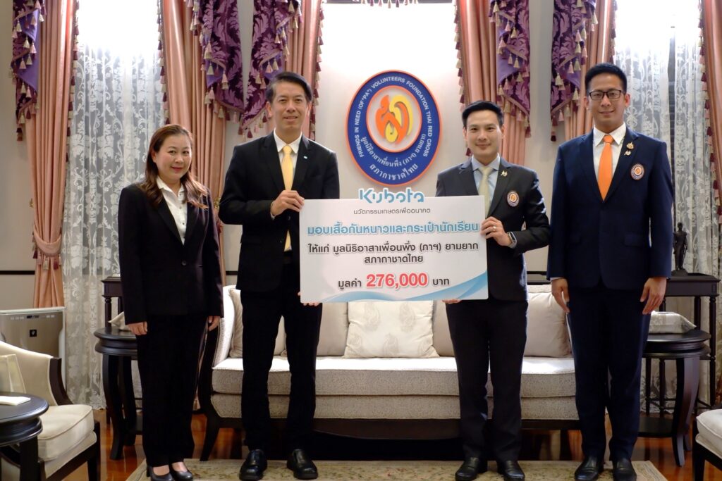 บริษัทสยามคูโบต้าคอร์ปอเรชั่น จำกัด นำโดย นายรัชกฤต สงวนชีวิน ผู้จัดการฝ่าย Sustainability Development (ลำดับที่ 2 จากซ้าย) มอบเสื้อกันหนาวและกระเป๋านักเรียน มูลค่า 276,000 บาท ให้แก่มูลนิธิอาสาเพื่อนพึ่ง (ภาฯ) ยามยาก สภากาชาดไทย โดยมี นายฐิติวัฒน์ ว่องวรรณกุล กรรมการและผู้จัดการมูลนิธิอาสาเพื่อนพึ่ง (ภาฯ) ยามยาก สภากาชาดไทย (ลำดับที่ 3 จากซ้าย) เป็นผู้รับมอบ เพื่อเป็นการสานต่อความช่วยเหลือให้แก่ผู้ประสบภัยจากสถานการณ์น้ำท่วมอย่างรุนแรง ในพื้นที่อำเภอแม่สาย จังหวัดเชียงราย ณ มูลนิธิอาสา เพื่อนพึ่ง (ภาฯ) ยามยาก เมื่อเร็วๆ นี้