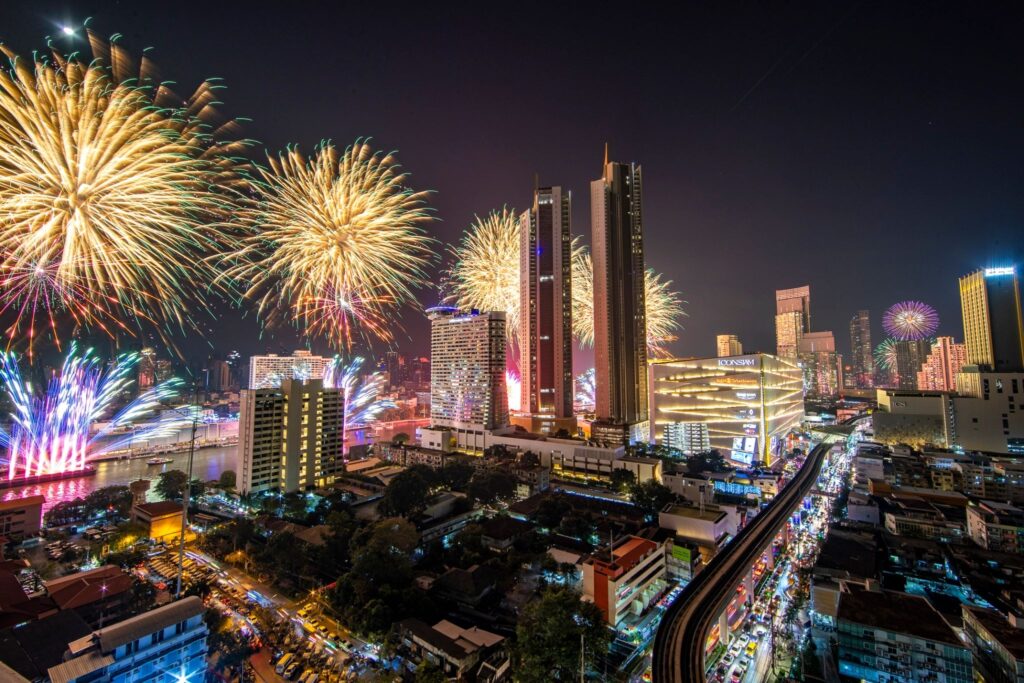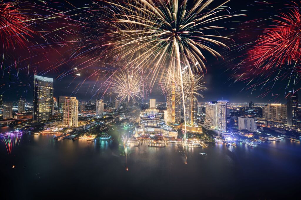 เตรียมพบกับมหาปรากฏการณ์พลุเฉลิมฉลองระดับโลก ตื่นตาตื่นใจกับการแสดงพลุรักษ์โลกบนโค้งน้ำที่สวยที่สุดของแม่น้ำเจ้าพระยากว่า 1,400 เมตร ครอบคลุมรัศมีการชมได้มากกว่า 5 กิโลเมตร ซึ่งในปีนี้ยังมีความพิเศษในด้านเทคนิค เพื่อสร้างมิติใหม่ให้กับการดูพลุในค่ำคืนวันเคานต์ดาวน์ จะได้เห็นพลุสีสันสดใส โทนสีใหม่อย่างสีพาสเทล สีทอง และรูปทรงที่หลากหลายสะดุดตา พลุทรงพัด พลุสายน้ำ หรือพลุที่กระจายตัวราวกับดอกเบญจมาศ บนฉากหลังของโค้งน้ำเจ้าพระยาที่งดงามที่สุด