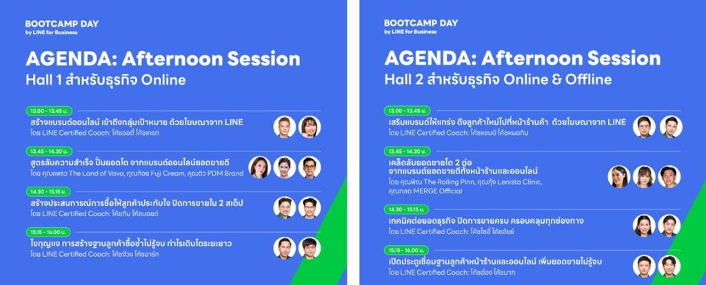 สำหรับช่วงบ่าย BOOTCAMP DAY 2025 ยังเตรียมหลากหลายหัวข้อสัมมนาให้ผู้ประกอบการสามารถเลือกเข้าร่วมได้ตามประเภทธุรกิจและความสนใจ ทั้งในส่วน Hall 1 สำหรับกลุ่มธุรกิจที่เน้นออนไลน์ และ Hall 2 สำหรับกลุ่มธุรกิจผสมที่มีทั้งหน้าร้านและออนไลน์ โดยมีวิทยากรหลักอย่างเหล่ากูรูผู้เชี่ยวชาญการตลาดดิจิทัล LINE Certified Coach เตรียมขนทัพความรู้มาให้เต็มพิกัด! หัวข้อสัมมนาในทั้ง 2 Hall ครอบคลุมทั้งเทคนิคการโฆษณาบน LINE เพื่อสร้างแบรนด์ให้แข็งแกร่ง ดึงดูดใจ เคล็ดลับและประสบการณ์การสร้างยอดขายให้โตไวจากหลากผู้ประกอบการ SME ไทยชื่อดังตัวจริง ไม่ว่าจะเป็น The Rolling Pin, PDM Brand, Lenista Clinic, Merge Official, The Land of Vava และ Fuji Cream เจาะลึกเทคนิคปิดการขาย และกลยุทธ์การสร้างฐาน รักษาฐานลูกค้าไว้เพื่อเติบโตระยะยาวได้ เพิ่มยอดขายไม่รู้จบ BOOTCAMP DAY 2025 พร้อมให้ SME ทุกท่านเก็บเกี่ยวความรู้แบบเจาะลึก อัดแน่นถึงใจ เพื่อนำไปปรับใช้สร้างการเติบโตได้จริง!