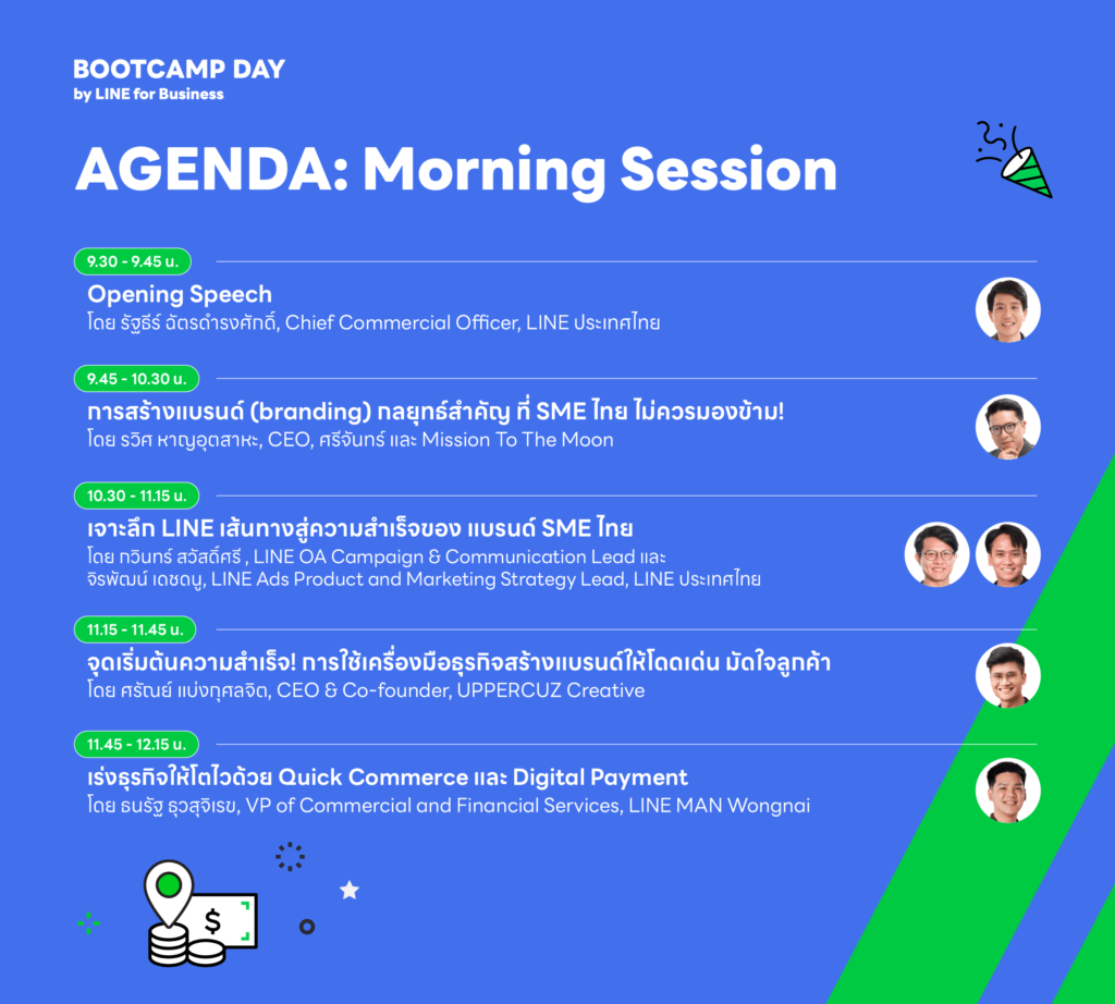 ภายในงาน อัดแน่นด้วยเนื้อหาความรู้มากมายที่ LINE for Business เตรียมให้ SME ไทย จากหลากหลายผู้เชี่ยวชาญด้านการตลาดและการสร้างแบรนด์ยุคใหม่ตลอดหนึ่งวันเต็ม! ไม่ว่าจะเป็น คุณรวิศ หาญอุตสาหะ CEO ศรีจันทร์ และ ‘Mission To The Moon’ มาร่วมแชร์มุมมองอันน่าสนใจอยากเดบิวต์เป็นแบรนด์ดังได้ ทำไมต้องเริ่มจากการสร้างแบรนด์? ตามมาด้วยสองผู้เชี่ยวชาญจาก LINE ประเทศไทย เจาะลึกถึงแนวคิด เทคนิคใหม่ๆ ในการใช้เครื่องมือบน LINE ปูทางสู่ความสำเร็จ ทั้งในเชิงการสร้างแบรนด์ สร้างยอดขาย สร้างประสบการณ์ให้ลูกค้าประทับใจที่หลายคนอาจยังไม่รู้! คุณศรัณย์ แบ่งกุศลจิต CEO & ผู้ร่วมก่อตั้ง Uppercuz Creative และเจ้าของเพจ ‘การตลาดการเตลิด’ กับการเปิดโลกเครื่องมือใหม่ๆ ช่วย SME ไทยสร้างแบรนด์ให้ปังได้ง่ายๆ และปิดท้ายช่วงเช้าด้วยผู้บริหารจาก LINE MAN Wongnai มาร่วมแชร์กลยุทธ์เร่งธุรกิจให้โตไวด้วย Quick Commerce และ Digital Payment ช่วย SME ไทยเพิ่มยอดขายและสร้างโอกาสทางธุรกิจใหม่ ๆ ได้อย่างรวดเร็วและมีประสิทธิภาพ
