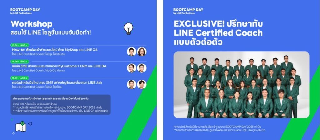 นอกจากเนื้อหาสุดเข้มข้นตลอดทั้งวันแล้ว BOOTCAMP DAY 2025 ยังมาพร้อมกิจกรรมและสิทธิพิเศษสำหรับผู้เข้าร่วมงานอีกมากมาย พลาดไม่ได้! กับกิจกรรม LINE Certified Coach Consultation โอกาสสุดพิเศษให้ผู้ประกอบการ SME ได้ปรึกษา LINE Certified Coach กูรูการตลาดดิจิทัลคนสำคัญกันแบบตัวต่อตัว ทั้งในเชิงกลยุทธ์การตลาด เทคนิคการใช้งานเครื่องมือ LINE เหล่า LINE Certified Coach พร้อมให้คำแนะนำสุดเอ็กซ์คลูซีฟกับคุณในงานนี้ที่เดียว! พร้อมด้วยโปรโมชั่นเด็ดและของรางวัลมากมายจากเหล่าบริษัทพันธมิตร ไม่ว่าจะเป็น LINE MAN Wongnai, LINE Pay, LINE BK, ไปรษณีย์ไทย และ สสว. ที่จะช่วยเสริมศักยภาพให้ SME ไทยเติบโตอย่างแข็งแกร่งไปด้วยกัน