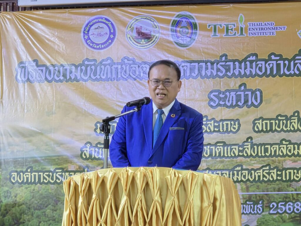 สถาบันสิ่งแวดล้อมไทย หรือ TEI ลงนามบันทึกข้อตกลงความร่วมมือกับ มหาวิทยาลัยราชภัฏศรีสะเกษ สำนักงานทรัพยากรธรรมชาติและสิ่งแวดล้อม จังหวัดศรีสะเกษ องค์การบริหารจังหวัดศรีสะเกษ เทศบาลเมืองศรีสะเกษ และบริษัทไมโครกรีนเทค จำกัด ในการดำเนินโครงการ “การพัฒนาสิ่งแวดล้อม สู่การเป็นมหาวิทยาลัยสีเขียวที่ดีอย่างยั่งยืน และการจัดการขยะโรงอาหารด้วยนวัตกรรมเพื่อสิ่งแวดล้อม (Zero waste Canteen)