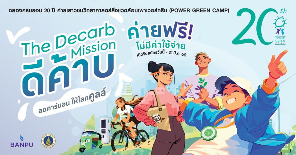 บริษัท บ้านปู จำกัด (มหาชน) ร่วมกับ คณะสิ่งแวดล้อมและทรัพยากรศาสตร์ มหาวิทยาลัยมหิดล อยากชวนนักเรียนชั้นมัธยมศึกษาปีที่ 4-6 ทั่วประเทศ (ไม่จำกัดแผนการเรียน) หรือระดับประกาศนียบัตรวิชาชีพ (ปวช.) ที่มีแพสชันในการอนุรักษ์สิ่งแวดล้อม และต้องการแสดงศักยภาพของคนรุ่นใหม่เพื่อร่วมสร้างสรรค์โลกให้คูลล์กว่าเดิม มาสมัครเข้าร่วม ค่ายเยาวชนวิทยาศาสตร์สิ่งแวดล้อม (Power Green Camp) ครั้งที่ 20 ซึ่งปีนี้จัดขึ้นภายใต้แนวคิด “ดีค้าบ – The Decarb Mission” ลดคาร์บอน ให้โลกคูลล์ เพื่อสร้างความรู้และความเข้าใจเกี่ยวกับการลดการปล่อยก๊าซคาร์บอนไดออกไซด์ (Decarbonization) และการนำเอาวิทยาศาสตร์และเทคโนโลยีไปช่วยแก้ไขปัญหาสิ่งแวดล้อมอย่างยั่งยืน