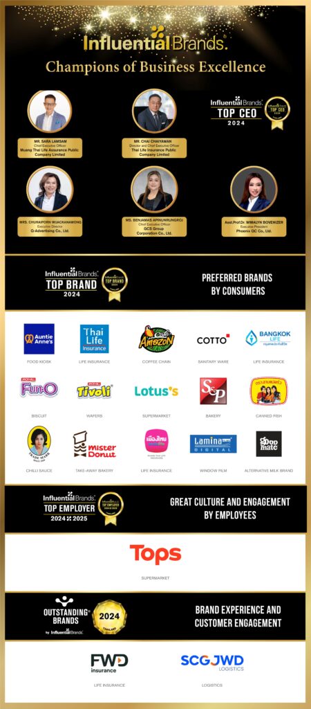 ส่วนแบรนด์ที่ได้รับการโหวตจากการทำวิจัย และมีผลงานที่โดดเด่น คือรางวัลแบรนด์ที่ทรงอิทธิพลต่อผู้บริโภคมากที่สุด (Top Influential Brand) มีจำนวน 15 แบรนด์ ได้แก่ Auntie Anne’s, Bangkok Life Insurance, Café Amazon, Cotto, Fun-O, Good Mate, Lamina, Lotus’s, Mae Pranom, Mister Donut, Muang Thai Life Assurance, S&P, Thai Life Insurance, Three Lady cook และ Tivoli ในส่วนของรางวัลแบรนด์ที่ประสบความสำเร็จในการดำเนินธุรกิจสูงสุดต่อเนื่อง (Outstanding Brands) มี 2 แบรนด์ที่ได้รับรางวัล ได้แก่ FWD Life Insurance และ SCGJWD นอกจากนี้ยังมี รางวัล Top Employer ได้แก่ Tops
