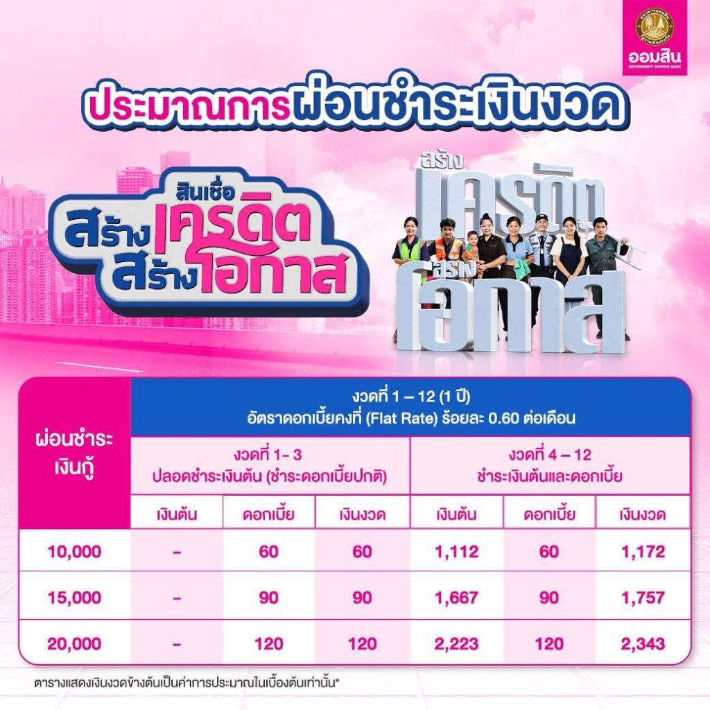 สำหรับโครงการ สินเชื่อสร้างงาน สร้างอาชีพ เป็นอีกหนึ่งสินเชื่อที่ผ่อนปรนเงื่อนไขกว่าสินเชื่อปกติของธนาคาร เพื่อส่งเสริมการเข้าถึงแหล่งทุนในระบบ สำหรับผู้ที่มีเครดิตทางการเงินและต้องการเงินทุนเพื่อเสริมสภาพคล่องในการประกอบอาชีพ วงเงินกู้สูงสุดไม่เกิน 50,000 บาทต่อราย ไม่ต้องมีหลักประกัน อัตราดอกเบี้ยคงที่ 0.75% ต่อเดือน ผ่อนชำระสูงสุดไม่เกิน 5 ปี ศึกษารายละเอียดเพิ่มเติมได้ที่ www.gsb.or.th หรือ GSB Contact Center โทร.1115