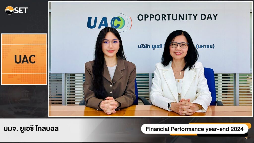 นางสาวอลิสา ชีวะเกตุ (ซ้าย) General Manager – Strategic Investment พร้อมด้วย นางอารีย์ พลีขันธ์ (ขวา) General Manager Accounting บมจ. ยูเอซี โกลบอล (UAC) ร่วมนำเสนอข้อมูลบริษัทฯ ในกิจกรรมบริษัทจดทะเบียนพบนักลงทุน (Opportunity Day) ผ่านแพลตฟอร์มออนไลน์ของตลาดหลักทรัพย์ฯ ตอกย้ำความแข็งแกร่งของ Cash Flow โดยจ่ายปันผลเพิ่ม 0.25 บาท/หุ้น ในวันที่ 9 พ.ค. 2568 หลังประกาศงบการเงินเฉพาะกิจการปี 2567 มีรายได้รวมกว่า 2,566.11 ล้านบาท เพิ่มขึ้น 67% (YoY) และกำไรสำหรับงวด 503.58 ล้านบาท เพิ่มขึ้น 133.67% (YoY) พร้อมเดินหน้าวางกลยุทธ์เสริมความแข็งแกร่ง ทั้งในส่วนของธุรกิจ Trading Energy และ Petroleum ลุยศึกษาแผนการลงทุนเพิ่มโอกาสการเติบโตอย่างยั่งยืนจากธุรกิจใหม่ๆ อาทิ Green Oleochemicals, Upcycling Industries และ Organic Farming & Ecosystems และเป้ารายได้รวมในปี 2568 โต 15% เมื่อเทียบจากปีก่อน และมี ROE และ EBITDA มากกว่า 20%