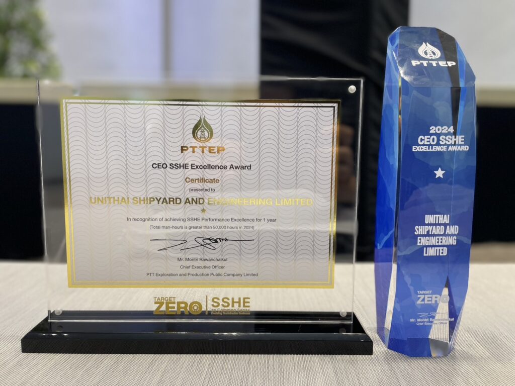 เรือเอก อภิเชษฐ์ บุญเผื่อน ผู้ช่วยกรรมการผู้จัดการและผู้อำนวยการฝ่ายปฏิบัติการ บริษัท ยูนิไทยชิปยาร์ด แอนด์ เอนจิเนียริ่ง จำกัด (UTSE) เป็นผู้แทนรับมอบรางวัล “CEO SSHE Excellence Award 2024” ในงาน SSHE Forum ซึ่งจัดโดยบริษัท ปตท.สำรวจและผลิตปิโตรเลียม จำกัด (มหาชน) หรือ PTTEP ณ พารากอนฮอลล์ ศูนย์การค้าสยามพารากอน