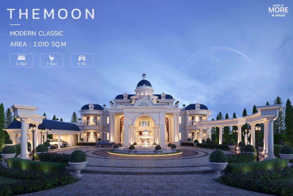 แบบบ้านซีรีส์ใหม่ “THE WORLD” ประกอบด้วย “THE MOON”  คฤหาสน์ 3 ชั้น สไตล์ Modern Classic ขนาด 2,010 ตร.ม. โดดเด่นด้วยดีไซน์สมมาตร (Symmetry Balance) ที่หรูหราเหนือกาลเวลา ขนาด 5 ห้องนอน 7 ห้องน้ำ และ 5 ที่จอดรถ พร้อมพื้นที่ใช้สอยครบครัน เช่น ห้องนอนมาสเตอร์ 2 ห้อง, Party Room, Golf Simulator และโซนรับวิวสระว่ายน้ำพระจันทร์เสี้ยวและสวนยุโรป