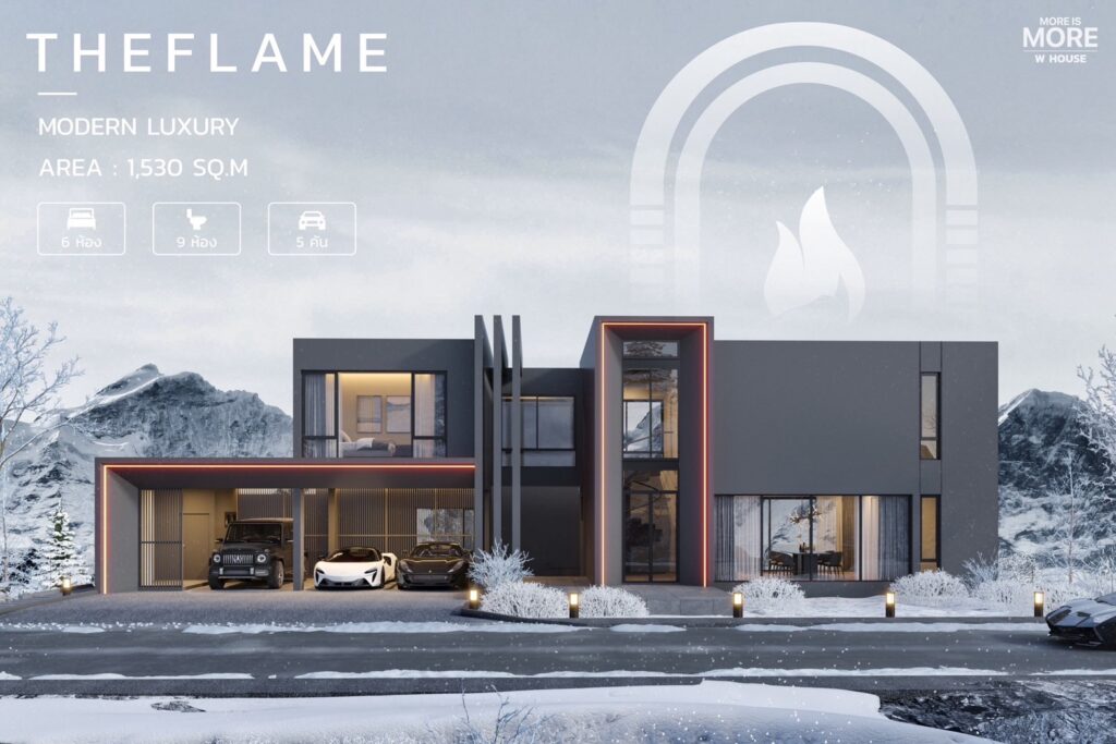 “THE FLAME”  คฤหาสน์ 4 ชั้น สไตล์ Super Modern Luxury ขนาด 1,530 ตร.ม. จำนวน 6 ห้องนอน 9ห้องน้ำ และ 5 ที่จอดรถ ซึ่งได้แรงบันดาลใจจากเปลวไฟ ใช้โทนสีดำและไฟแดงส้มสร้างเอกลักษณ์ให้บ้านดูดุดัน หรูหรา และทรงพลัง พร้อมฟังก์ชันที่จัดจังหวะการใช้ชีวิตแบบไดนามิก
