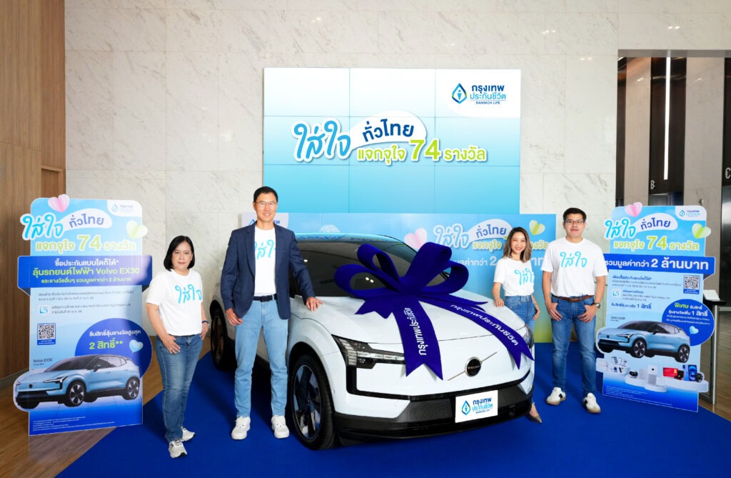 กรุงเทพประกันชีวิต โดย นายโชน โสภณพนิช กรรมการผู้จัดการใหญ่และประธานเจ้าหน้าที่บริหาร และคณะผู้บริหารระดับสูง ฉลองวาระครบรอบ 74 ปี จัดแคมเปญใหญ่ “ใส่ใจทั่วไทย แจกจุใจ 74 รางวัล” เชิญชวนลูกค้าคนสำคัญลุ้นรับรางวัล รถยนต์ไฟฟ้า Volvo EX30 Ultra – Twin Motor Performance สี Cloud Blue มูลค่า 1,540,000 บาท พร้อมของรางวัลอื่น ๆ อีกมากมาย โดยได้คัดสรรของรางวัลด้วยความใส่ใจต่อสิ่งแวดล้อม สุขภาพ คุณภาพชีวิตและความมั่งคั่ง เพื่อมอบเป็นของขวัญให้แก่ลูกค้าที่ได้ให้ความไว้วางใจให้กรุงเทพประกันชีวิตได้ดูแล ร่วมรับสิทธิ์ได้แล้วตั้งแต่วันนี้ ถึงวันที่ 31 ตุลาคม 2568 ดูรายละเอียดเพิ่มเติมได้ที่เว็บไซต์กรุงเทพประกันชีวิต https://bla.bangkoklife.com/BLA74th หรือติดต่อ Call Center โทร. 02-777-8888