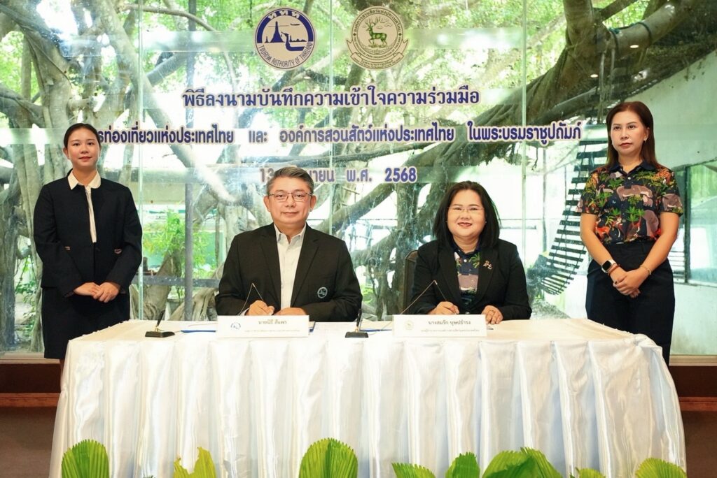 วันนี้ (13 พฤษภาคม 2568) ททท. นำโดยนายนิธี สีแพร รองผู้ว่าการ ด้านสื่อสารการตลาด ททท. และ องค์การสวนสัตว์แห่งประเทศไทย ในพระบรมราชูปถัมภ์ (อสส.) นำโดยนางสมรักษ์ บุษปธำรง รองผู้อำนวยการองค์การสวนสัตว์แห่งประเทศไทย (สายปฏิบัติการและพัฒนาธุรกิจ) ร่วมลงนามบันทึกความร่วมมือ “การดำเนินการประชาสัมพันธ์และส่งเสริมการตลาดการท่องเที่ยวประเทศไทย” เพื่อกระตุ้นตลาดการท่องเที่ยวในประเทศและผลักดันอุตสาหกรรมท่องเที่ยวให้เติบโตอย่างยั่งยืน ณ ห้องประชุมศูนย์อนุรักษ์ธรรมชาติและสิ่งแวดล้อม สวนสัตว์เปิดเขาเขียว จังหวัดชลบุรี