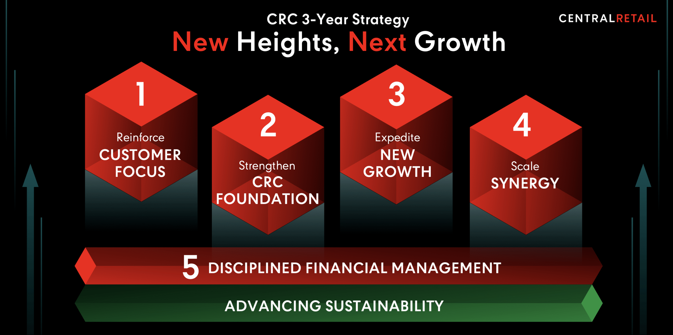 4. Scale Synergy สร้างความร่วมมืออย่างเข้มข้นทั้งในองค์กรและนอกองค์กร โดยมุ่งเน้นการทำงานร่วมกันกับธุรกิจทั้งหมดในเครือเซ็นทรัล รีเทล และเซ็นทรัลกรุ๊ป ทั้งในเชิงการเพิ่มยอดขาย และผลักดันการทำงานร่วมกันของพนักงานในกลุ่มธุรกิจต่าง ๆ เพื่อเพิ่มประสิทธิภาพสูงสุดในการทำงาน ตลอดจนการบริหารพื้นที่ขายให้ตอบโจทย์ลูกค้า พร้อมเพิ่มผลตอบแทนการลงทุน (ROI) ด้วยโมเดล Mix-used และ Hybrid Retail Store