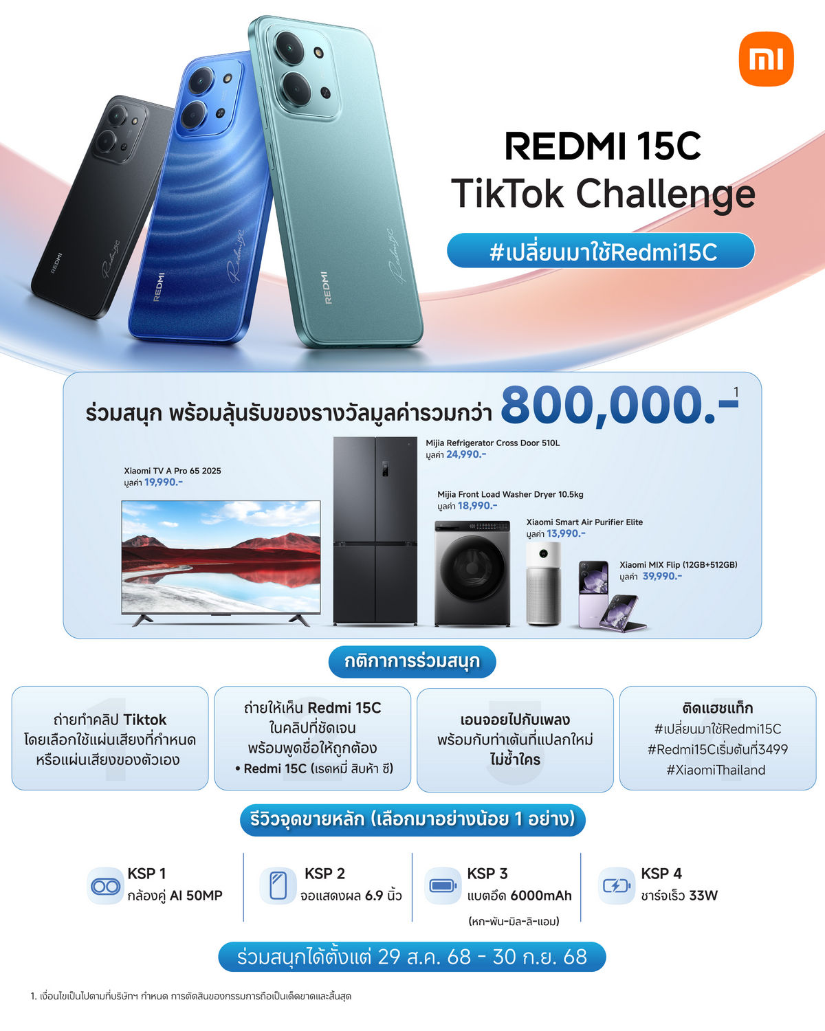นอกจากนี้เสียวหมี่ ประเทศไทย ยังขอชวนลูกค้าที่ซื้อ Redmi 15C มาร่วมสนุกทำคลิป Redmi 15C TikTok Challenge เพื่อลุ้นรับของรางวัลมูลค่ารวมกว่า 800,000 บาท17 ตามกติกาที่เสียวหมี่กำหนด โดยสามารถดูรายละเอียดกติกาการร่วมสนุกเพิ่มเติมได้ที่โพสกิจกรรมบนช่องทาง Official Facebook Page ของ Xiaomi Thailand สามารถร่วมสนุกได้ในระหว่างวันที่ 29 สิงหาคม 2568 – 30 กันยายน 256817