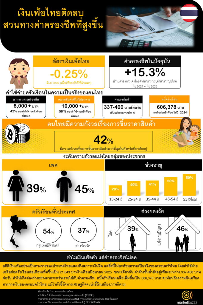 จากการศึกษาของ Marketbuzzz ที่สำรวจคนไทย 865 คนทั่วประเทศ พบว่า หลายครอบครัวกำลังประสบปัญหาอย่างหนัก จากค่าใช้จ่ายในชีวิตประจำวันที่สูงขึ้น ในขณะที่ค่าแรงยังคงทรงตัว ความไม่สอดคล้องกันระหว่างตัวชี้วัดทางเศรษฐกิจอย่างเป็นทางการกับความเป็นจริงในชีวิตประจำวันนั้นเห็นได้ชัดเจน โดยเฉพาะในกลุ่มต่างๆ เช่น