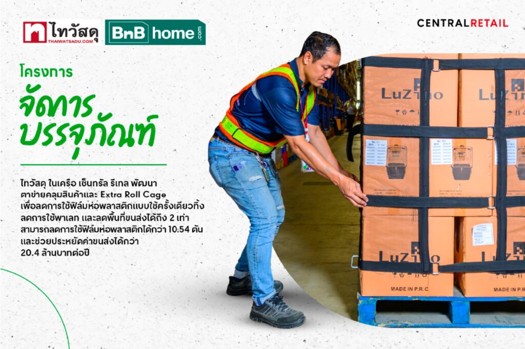 ไทวัสดุ และบีเอ็นบี โฮม ผู้นำธุรกิจค้าปลีกวัสดุก่อสร้างและสินค้าตกแต่งบ้าน ภายใต้บริษัท ซีอาร์ซี ไทวัสดุ จำกัด ในเครือเซ็นทรัล รีเทล เดินหน้าสานต่อภารกิจด้านสิ่งแวดล้อมในแคมเปญ “Love the Earth – Zero Waste” ภายใต้การดำเนินงานของกลุ่มเซ็นทรัล รีเทล เพื่อก้าวสู่องค์กรที่มีระบบจัดการขยะครบวงจร ขับเคลื่อนภาคธุรกิจเพื่อเศรษฐกิจหมุนเวียนและคุณภาพด้านสิ่งแวดล้อมที่ดียิ่งขึ้น และปักหมุดหมายการลดขยะให้เป็นศูนย์ โดยล่าสุดได้ดำเนิน “โครงการจัดการบรรุภัณฑ์” พัฒนาตาข่ายคลุมสินค้า และ Extra Roll Cage มาใช้ในศูนย์กระจายสินค้า (DC) เพื่อลดการใช้ฟิล์มห่อหุ้มพลาสติกแบบใช้ครั้งเดียวทิ้งและลดการใช้พาเลท สามารถลดปริมาณการใช้ฟิล์มพลาสติกหุ้มได้มากถึง 10.54 ตันต่อปี พร้อมช่วยลดต้นทุน โลจิสติกส์รวมได้กว่า 20.4 ล้านบาทต่อปี และลดพื้นที่ในการขนส่งได้จากเดิมถึง 2 เท่า