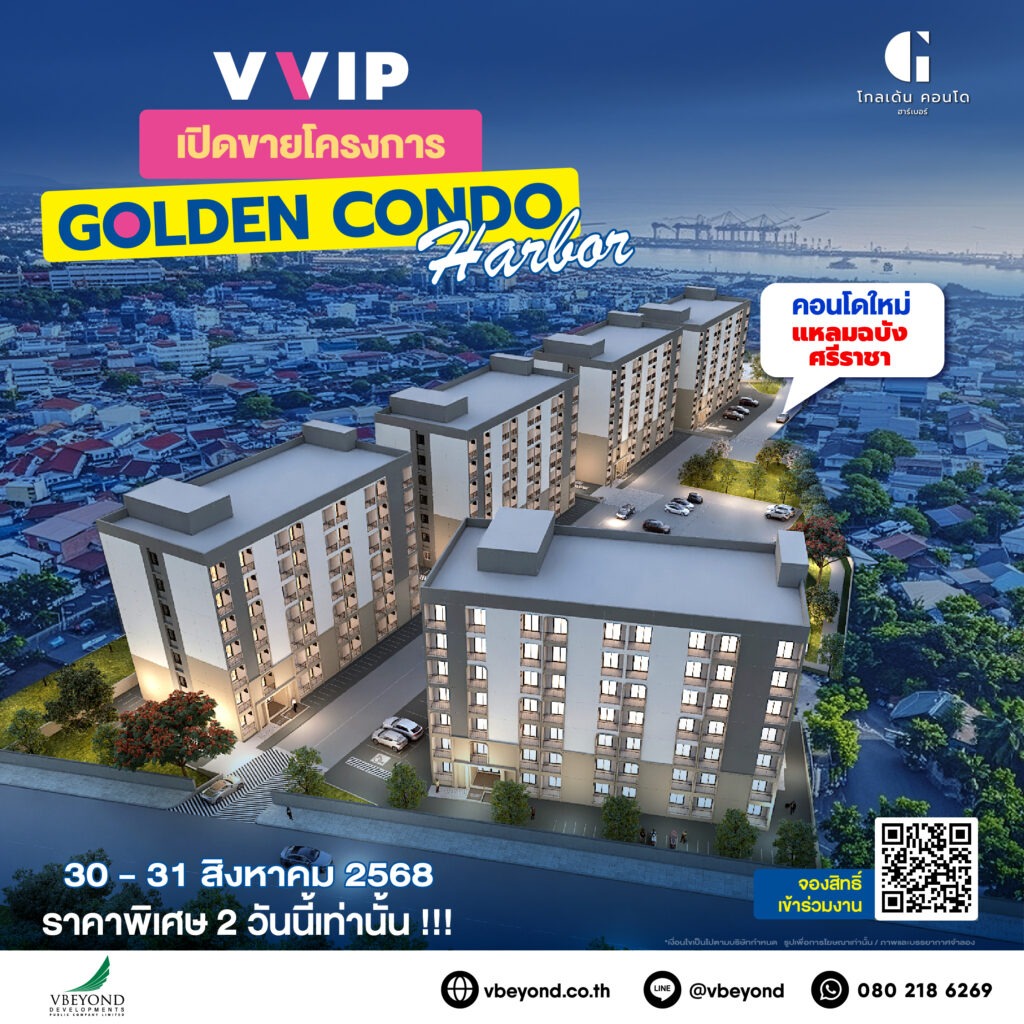 เดินหน้าขยายตลาดสู่ภาคตะวันออกอย่างต่อเนื่อง ล่าสุด บริษัท วี บียอนด์ ดีเวลอปเม้นท์ จำกัด (มหาชน) เตรียมจัดงาน “VVIP DAY” เปิดตัวคอนโดมิเนียมทำเลศักยภาพใจกลางแหลมฉบัง – ศรีราชา จ.ชลบุรี “Golden Condo Harbor” แบบ Exclusive เป็นครั้งแรก ในวันที่ 30-31 ส.ค.นี้ เพื่อตอบสนอง Demand การอยู่อาศัยและนักลงทุน ราคาเริ่มต้นเพียง 1.49 ล้านบาท พร้อมเปิดโปรลับเฉพาะในงาน รวมทั้งส่วนลด ของแถม และราคา Shock Price 2 วัน เท่านั้น!!! ณ โครงการ Golden Condo Harbor แหลมฉบัง – ศรีราชา