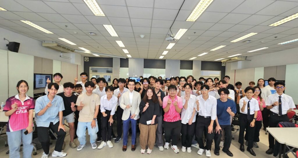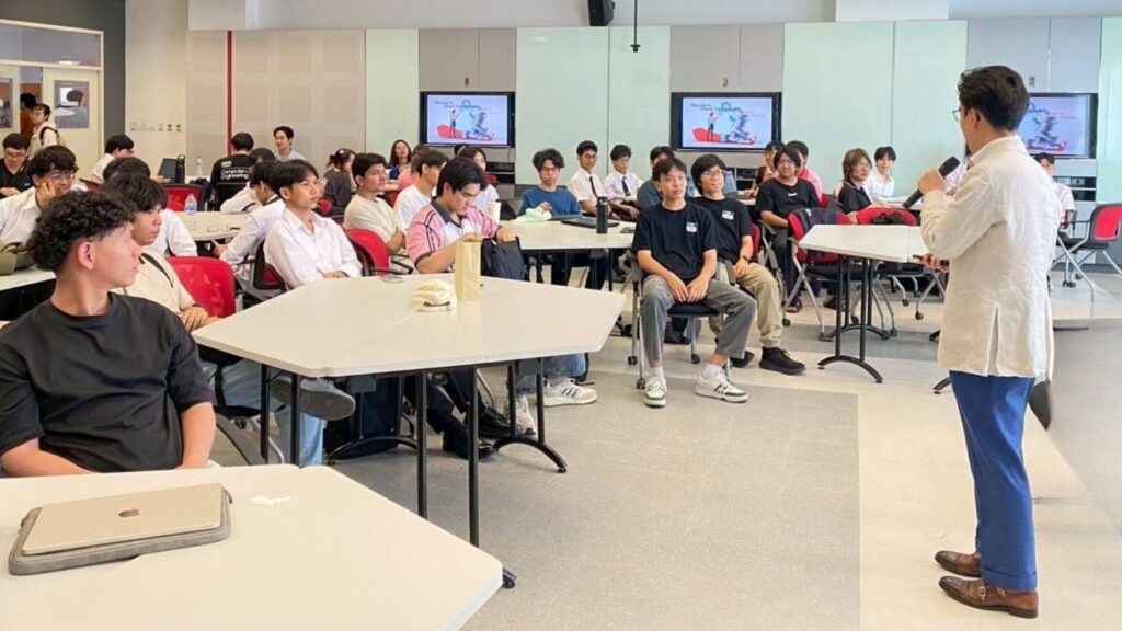 บรรยากาศช่วงถาม–ตอบ น้องๆ ให้ความสนใจการประยุกต์ความรู้สายวิศวะต่อยอดสู่เส้นทางอาชีพด้านการเงิน การวิเคราะห์ข้อมูล และการพัฒนาแอปพลิเคชันด้านการลงทุน เพื่อช่วยวางแผนและกำกับวินัยการออม–ลงทุนอย่างเป็นระบบ นอกจากนี้ นิสิตบางส่วนยังอยากทราบมุมมองเชิงลึกของ “โมเดลธุรกิจ” และอนาคตของธุรกิจดั้งเดิมในไทย—ตั้งแต่ค้าปลีก สื่อดั้งเดิมไปจนถึงบริการการเงินแบบเก่า ท่ามกลางความเปลี่ยนแปลงทางเศรษฐกิจและเทคโนโลยีที่รวดเร็ว รวมทั้งแนวทางการปรับตัวของธุรกิจอย่างยั่งยืน สะท้อนว่านิสิตไม่ได้สนใจเพียงการเงินส่วนบุคคล แต่ยังให้ความสำคัญกับพลวัตเศรษฐกิจและการแข่งขันทางธุรกิจระยะยาว ซึ่งแสดงถึงศักยภาพและความมุ่งมั่นของคนรุ่นใหม่ที่จะขับเคลื่อนนวัตกรรม พัฒนาโมเดลธุรกิจใหม่ และเสริมความแข็งแกร่งให้เศรษฐกิจไทยก้าวทันโลกในอนาคต”