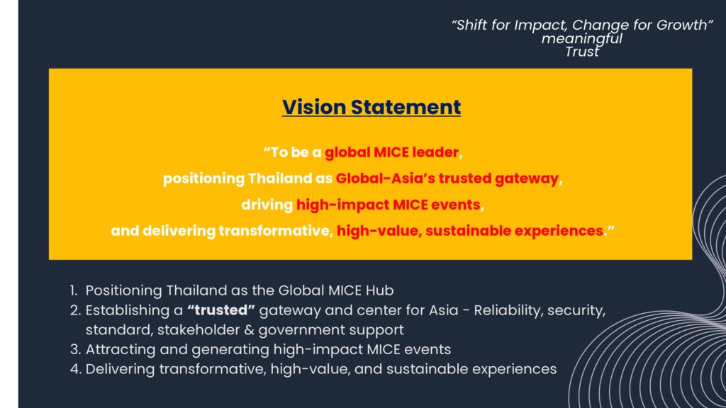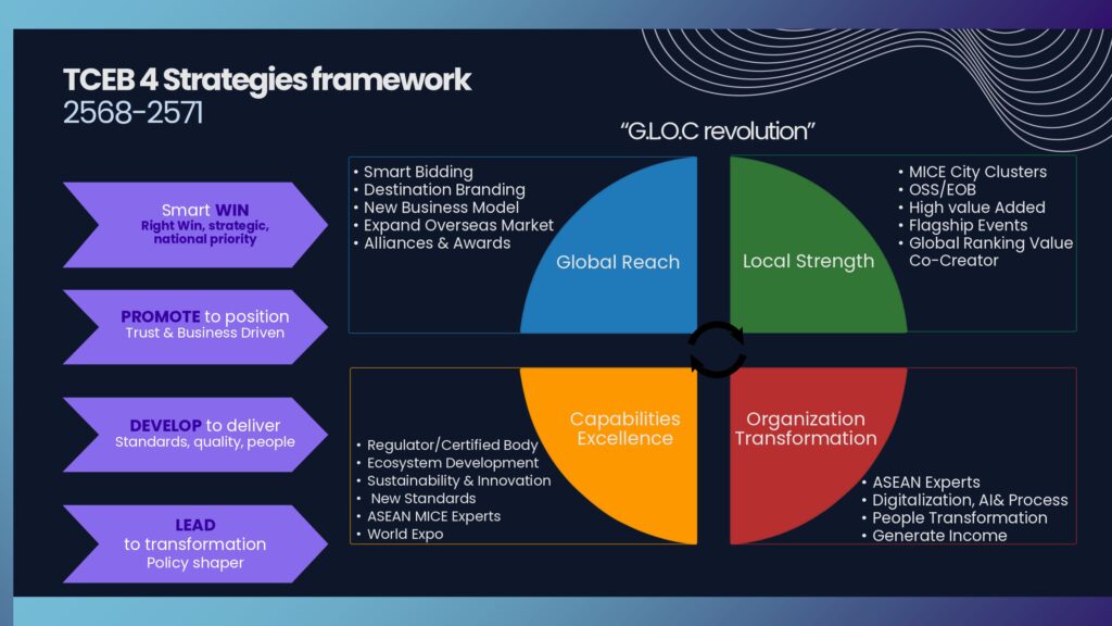 Global Reach: มุ่งเน้นการสร้างแบรนด์จุดหมายปลายทาง การประมูลงานไมซ์ระดับนานาชาติอย่างชาญฉลาด (Smart Bidding) การขยายตลาดในต่างประเทศ และการสร้างพันธมิตรเชิงกลยุทธ์ เพื่อดึงงานที่มีผลกระทบสูงเข้ามาจัดในประเทศ