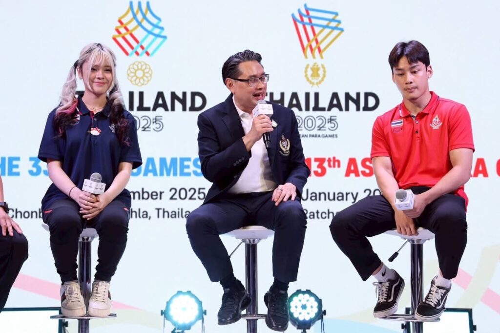 ดร.ก้องศักด ยอดมณี ผู้ว่าการการกีฬาแห่งประเทศไทย (กกท.) เป็นประธานในงานแถลงข่าว 9 เดือน 9 นับถอยหลัง 90 วัน รวมใจคนไทย เชียร์ให้สุดใจ คว้าชัยซีเกมส์และอาเซียนพาราเกมส์ โดยมี นายธนา ไชยประสิทธิ์ รองประธานและเลขาธิการคณะกรรมการโอลิมปิคแห่งประเทศไทย ฯ, นายณัฐพล ณ สงขลา ผู้อำนวยการกองการทูตวัฒนธรรม ผู้แทนกระทรวงการต่างประเทศ , นางสาวพีร์ภากรมณณ์ เนียมใย นักการทูตชำนาญการ (ที่ปรึกษา), นายชาญวิทย์ มุนิกานนท์ นายกสมาคมกีฬาคนพิการทางปัญญาแห่งประเทศไทย ผู้แทนสหพันธ์กีฬาคนพิการแห่งอาเซียน (APSF) นางโปรดปราน สมานมิตร รองผู้ว่า กกท. ฝ่ายกีฬาอาชีพและกีฬามวย, นายธัชนาถ ทองประกอบ รองผู้ว่าการ กกท. ฝ่ายยุทธศาสตร์และเทคโนโลยีสารสนเทศ, นางสาวศมจรส มิ่งคำเลิศ ผู้อำนวยการสำนักผู้ว่าการ และโฆษก กกท. , นักกีฬาทีมชาติ, สื่อมวลชนชาวไทย และสื่อมวลชนจากอาเซียน ร่วมงาน ณ ลาน Beacon 2 ชั้น 1 เซ็นทรัล เวิลด์ เมื่อวันที่ 9 ก.ย. 2568 ที่ผ่านมา ท่ามกลางบรรยากาศคึกคักจากผู้ที่มาร่วมงาน เพื่อร่วมรับชมไฮไลท์ของงานอย่างพร้อมเพรียง