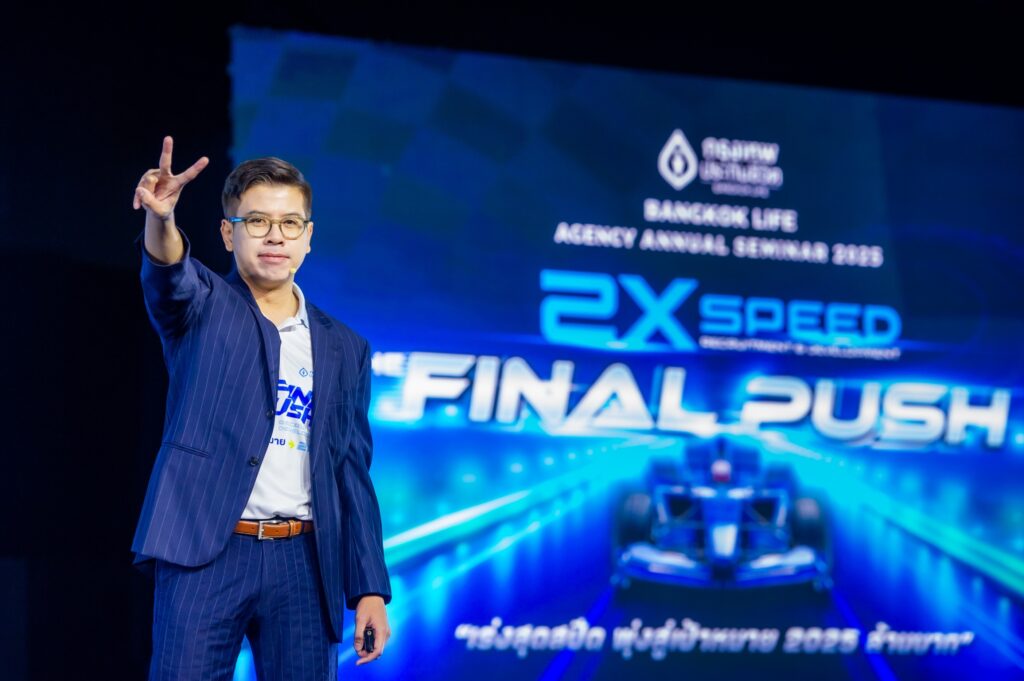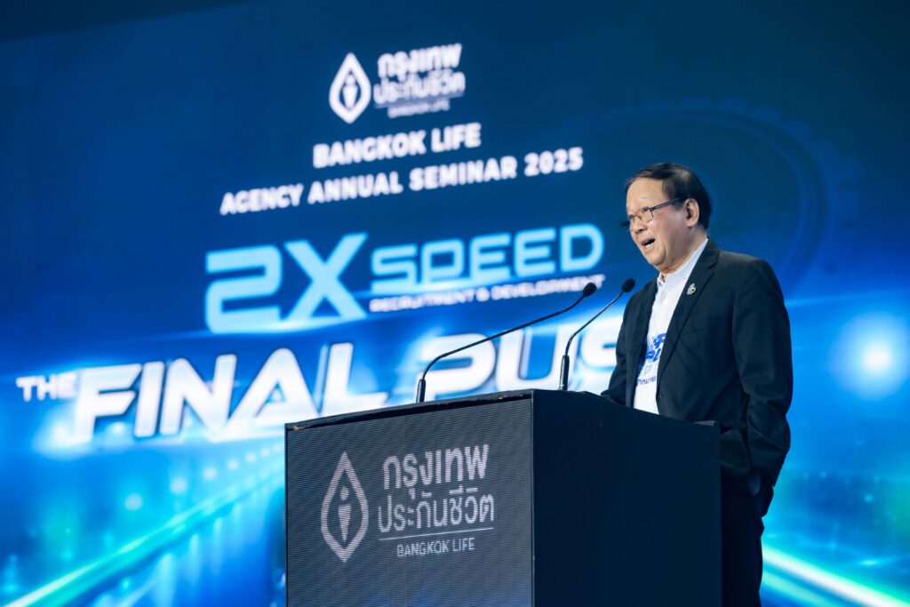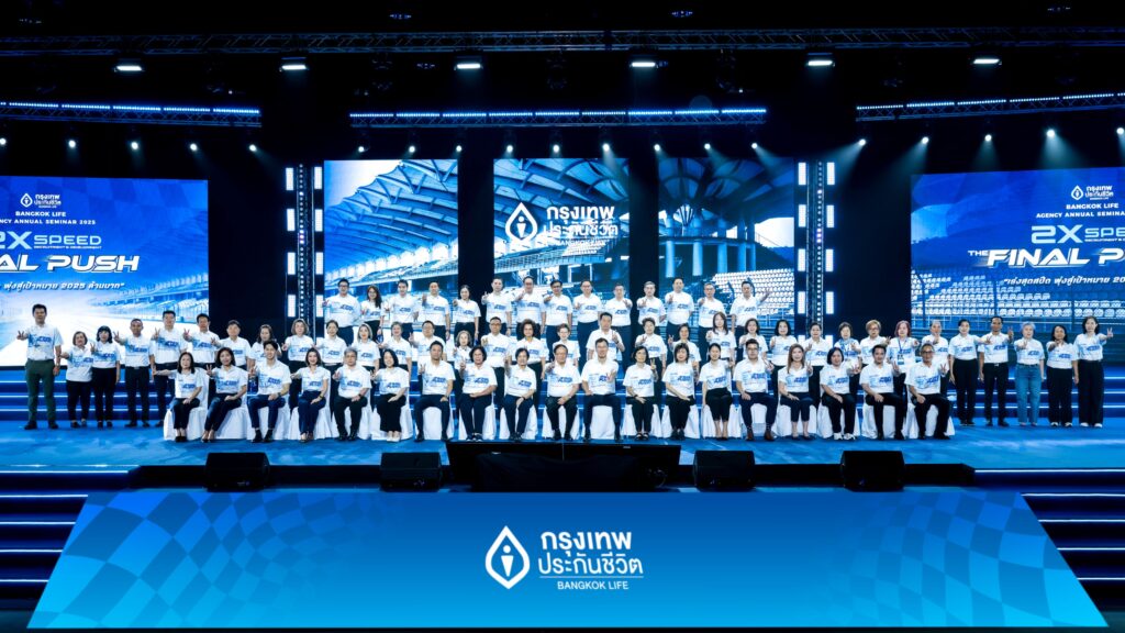 กรุงเทพประกันชีวิต จัดงานสัมมนาใหญ่ฝ่ายขายประจำปี 2568 Bangkok Life Agency Annual Seminar 2025 ภายใต้แนวคิด “2X Speed The Final Push เร่งสุดสปีด พุ่งสู่เป้าหมาย 2025 ล้านบาท” ปลุกพลังทีมนักขายร่วมขับเคลื่อนองค์กรในการเร่งสร้างและพัฒนาเพื่อเป็น “ตัวแทนของความใส่ใจ” ทั้งลูกค้าและทีมงาน ตามวิสัยทัศน์ในการก้าวสู่การเป็นบริษัทประกันชีวิตอันดับ 1 ในด้านความ “ใส่ใจ” เพื่อสร้างการเติบโตอย่างยั่งยืน โดยมี ดร.ศิริ การเจริญดี ประธานกรรมการ เป็นประธานเปิดงาน พร้อมด้วย นายโชน โสภณพนิช กรรมการผู้จัดการใหญ่และประธานเจ้าหน้าที่บริหาร และผู้บริหารระดับสูง ตัวแทน ผู้บริหารตัวแทนประกันชีวิตและที่ปรึกษาทางการเงินจากทั่วประเทศร่วมงานกว่า 1,300 คน ณ โรงแรมรอยัล คลิฟ โฮเต็ล กรุ๊ป พัทยา