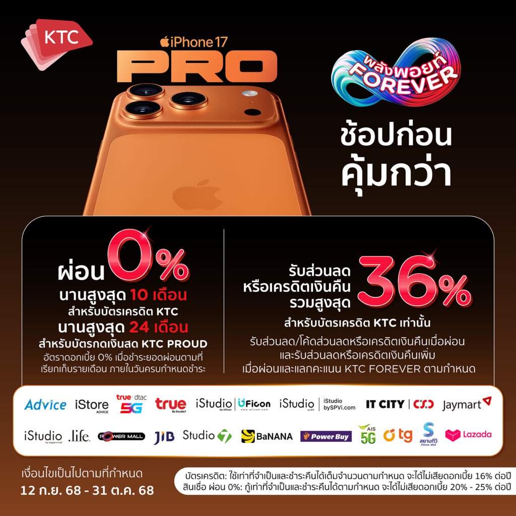 สิ่งสำคัญที่สุดคือการหาสมดุลระหว่าง “ความอยากอัพเกรด” กับ “ความมั่นคงทางการเงิน” และนี่คือบทบาทที่สถาบันการเงินอย่างเคทีซีสามารถเข้ามาช่วยเติมเต็ม การเปิดตัว iPhone 17 นี้ เคทีซีจัดแคมเปญพิเศษที่ออกแบบมาเพื่อเป็นทางเลือกให้ผู้บริโภคสามารถตัดสินใจได้ง่ายขึ้น โดยมอบสิทธิประโยชน์แก่สมาชิกบัตรเครดิตเคทีซี และบัตรกดเงินสด “เคทีซี พราว” ระหว่าง 12 ก.ย. 68 – 31 ต.ค. 68  ไม่ว่าจะเป็นการผ่อน 0% นานสูงสุด 10 เดือนสำหรับบัตรเครดิตเคทีซี และผ่อน 0% นานสูงสุด 24 เดือนสำหรับบัตรกดเงินสดเคทีซีพราว และพิเศษสำหรับบัตรเครดิตเคทีซี  ต่อที่ 1 รับส่วนลด/เครดิตเงินคืนสูงสุด 6% และต่อที่ 2 แลกคะแนนรับส่วนลด/เครดิตเงินคืนเพิ่มสูงสุด 30% ร่วมกับร้านชั้นมือถือ, ไอทีและเครื่องใช้ไฟฟ้าชั้นนำ  ได้แก่ Advice, Advice iStore, TRUE, DTAC, TRUE by Double7, iStudio by Uficon, iStudio by SPVI, IT City, Jaymart, iStudio by Copperwired, dotlife, Power Mall, JIB , JIB Mobile, Studio7, BaNANA, Power Buy, AIS, TG และ SiamTV Apple Store ทำให้การเปลี่ยนเครื่องครั้งนี้ ไม่เพียงแต่ได้เทคโนโลยีใหม่ที่ตอบโจทย์ความต้องการ แต่ยังได้รับสิทธิประโยชน์ควบคู่กันไป