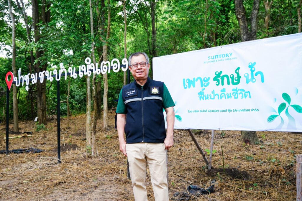 นางสาวกิ่งดาว จีนหนู เจ้าหน้าที่ศูนย์ป่าไม้ชลบุรี สำนักจัดการทรัพยากรป่าไม้ที่ 9 จังหวัดชลบุรี กล่าวว่า “ป่าชุมชนบ้านเนินตองมีพื้นที่กว่า 24 ไร่ เปรียบเสมือนหัวใจของชุมชนในพื้นที่แห่งนี้ ขอขอบคุณ ซันโทรี่ เบเวอเรจ แอนด์ ฟู้ด (ประเทศไทย) ที่ให้ความสำคัญกับการร่วมมือกับภาครัฐและชุมชนในการดูแลป่าแห่งนี้ ด้วยการจัดโครงการ ‘เพาะรักษ์น้ำ ฟื้นป่าคืนชีวิต’ เพื่อถ่ายทอดความรู้ด้านการดูแลป่าอย่างยั่งยืนให้กับผู้ร่วมกิจกรรม รวมถึงยังได้เชิญชวนพนักงานจิตอาสา หน่วยงานราชการ ชุมชน และนักเรียนในพื้นที่ มามีส่วนร่วมในการฟื้นฟูป่าผืนนี้ด้วยกัน ผ่านกระบวนการดูแลป่าและต้นไม้แบบครบวงจร 4 ขั้นตอน ประกอบด้วย การปลูกต้นกล้าใหม่ในพื้นที่ฟื้นฟู การซ่อมแซมโดยกำจัดวัชพืชและปักหลักไม้เพื่อดูแลต้นไม้เดิมให้แข็งแรง การคลุมฟางรอบโคนเพื่อรักษาความชื้นของดินและลดวัชพืชใหม่ และการรดน้ำทั้งต้นไม้เดิมและต้นกล้าที่ปลูกใหม่ เรียกได้ว่า โครงการนี้ไม่เพียงช่วยเพิ่มพื้นที่สีเขียว แต่ยังให้องค์ความรู้และแนวปฏิบัติที่ถูกต้อง ตลอดจนปลูกจิตสำนึกด้านการอนุรักษ์สิ่งแวดล้อมให้กับเยาวชนรุ่นใหม่และคนในพื้นที่อีกด้วย”