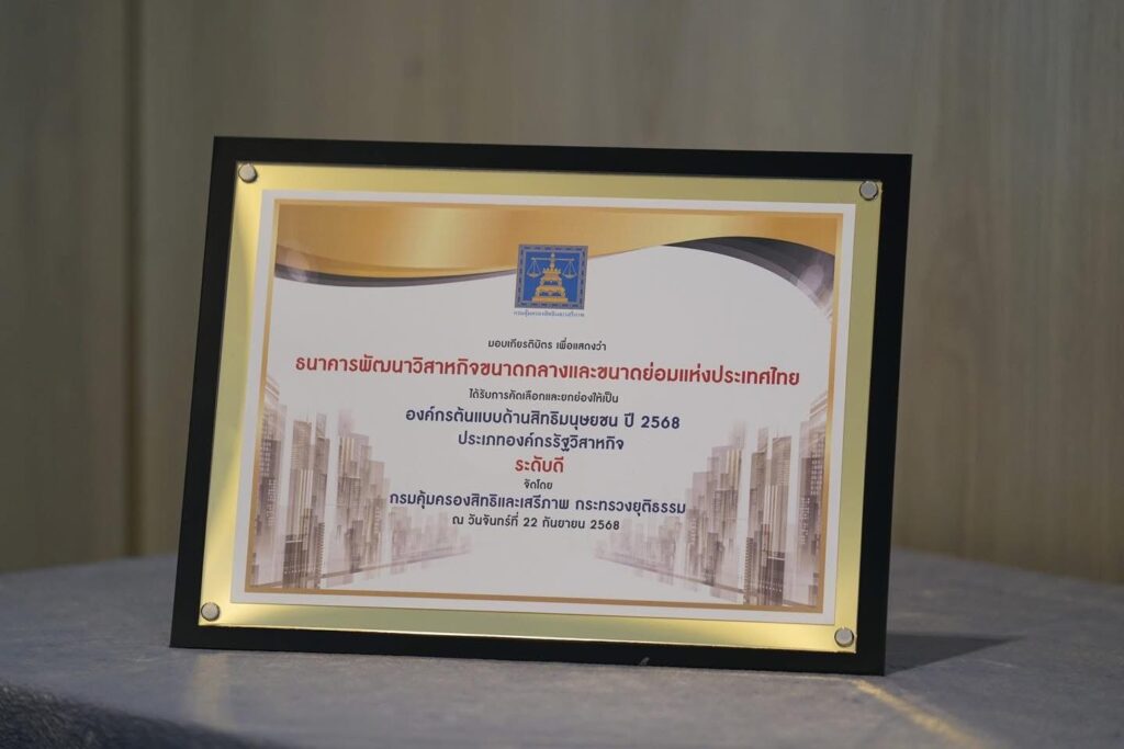 นายพิชิต มิทราวงศ์ กรรมการผู้จัดการ ธนาคารพัฒนาวิสาหกิจขนาดกลางและขนาดย่อมแห่งประเทศไทย (ธพว.) หรือ SME D Bank รับรางวัลทรงเกียรติ “องค์กรต้นแบบด้านสิทธิมนุษยชน ประจำปี 2568” ประเภท “ดี” องค์กรรัฐวิสาหกิจ จากกรมคุ้มครองสิทธิและเสรีภาพ กระทรวงยุติธรรม จากการดำเนินงานโดดเด่นขององค์กรที่ตระหนักถึงสิทธิมนุษยชนอย่างเป็นรูปธรรม ส่งเสริมและสนับสนุนการปฏิบัติตามหลักการด้านสิทธิมนุษยชนในทุกมิติ มุ่งเน้นการสร้างโอกาสอย่างเท่าเทียม เป็นธรรม และการมีส่วนร่วมของผู้มีส่วนได้ส่วนเสียทุกภาคส่วน ตลอดจนส่งเสริมสิทธิมนุษยชนในภาคธุรกิจอย่างต่อเนื่อง อันเป็นปัจจัยสำคัญทำให้องค์กร และผู้ประกอบการเอสเอ็มอี เติบโตอย่างเข้มแข็งและยั่งยืนบนพื้นฐานของความรับผิดชอบต่อสังคม