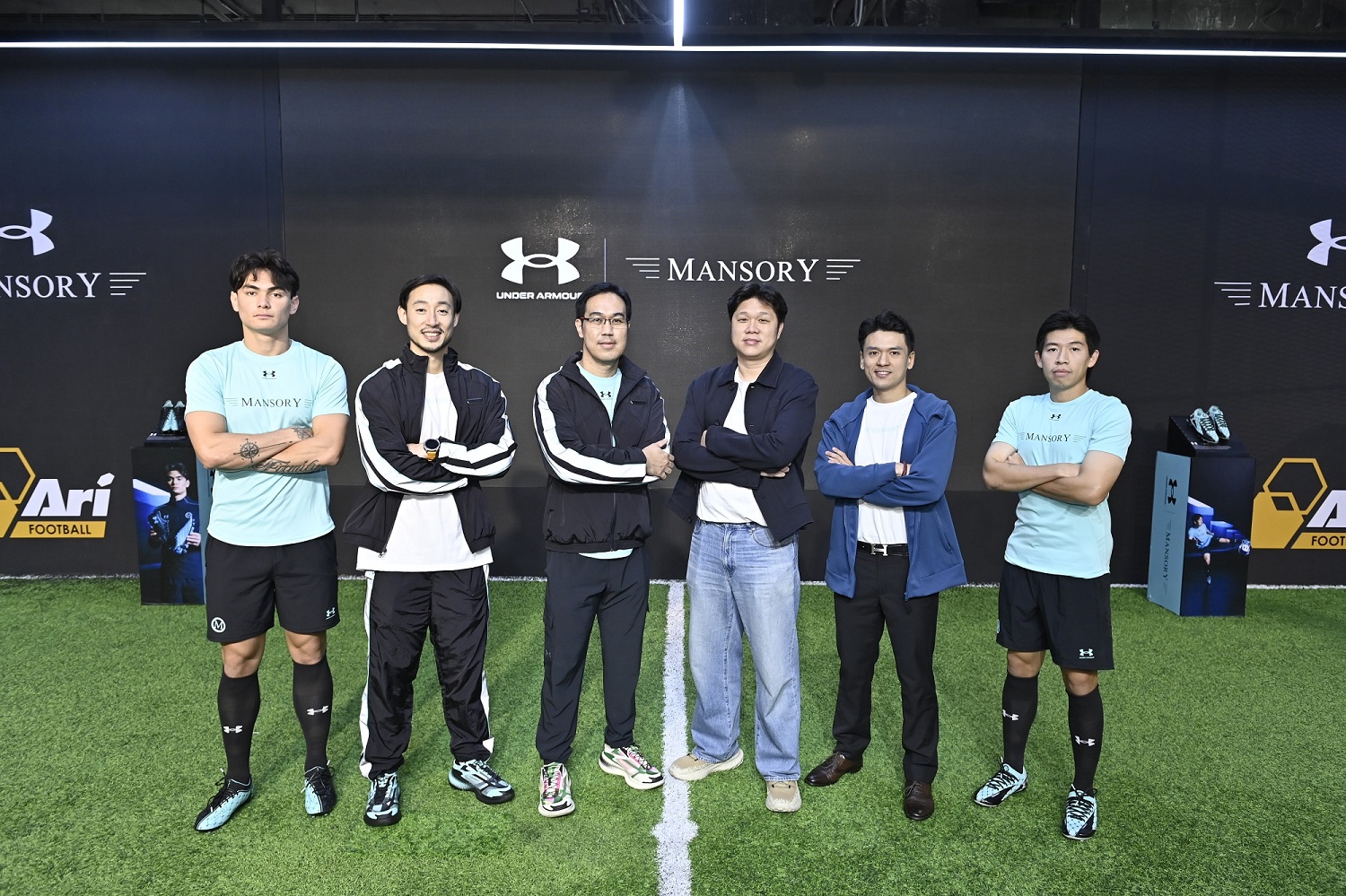 เรียงจากซ้ายไปขวา คุณโจนาธาร เข็มดี นักฟุตบอล UA Athlete, คุณเทพฤทธิ์ ไรวินทร์ ผู้จัดการอาวุโสฝ่ายการตลาด บริษัท ยูเอ สปอร์ต ประเทศไทย, คุณณัฐพล พานิชกุล ผู้อำนวยการฝ่ายพาณิชย์ บริษัท ยูเอ สปอร์ต ประเทศไทย, คุณณัฐพล เอื้อผาติกุล ผู้จัดการอาวุโสฝ่ายบริหารผลิตภัณฑ์ อาริ ฟุตบอล, คุณต่อ ณ ระนอง หัวหน้าทีมด้านการสื่อสารแบรนด์ อาริ ฟุตบอล, คุณศิวกรณ์ เตียตระกูล นักฟุตบอล UA Athletes