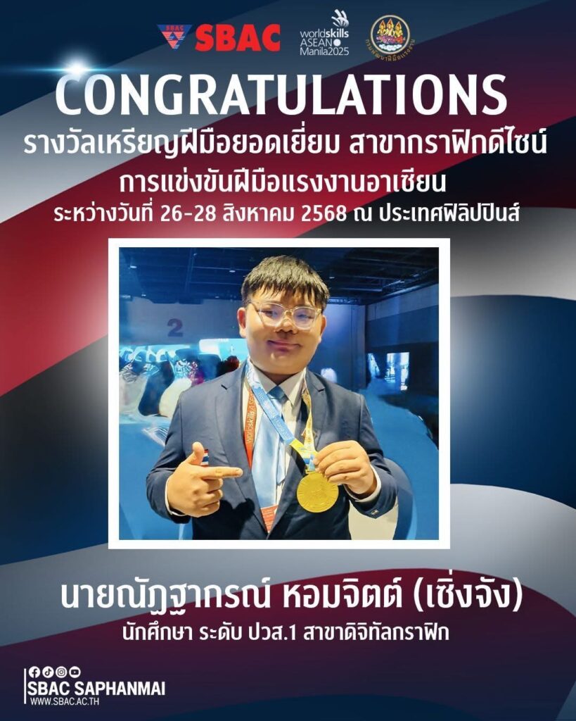 บริษัท แคนนอน มาร์เก็ตติ้ง (ไทยแลนด์) จำกัด ร่วมแสดงความยินดีกับนายณัฏฐากรณ์ หอมจิตต์ นักศึกษาระดับ ปวส.1 สาขาดิจิทัลกราฟิก วิทยาลัยเทคโนโลยีสยามบริหารธุรกิจ วิทยาเขตสะพานใหม่ ที่คว้ารางวัลเหรียญทอง “ฝีมือยอดเยี่ยม” สาขากราฟิกดีไซน์ จากการแข่งขันฝีมือแรงงานอาเซียน ครั้งที่ 14 (WorldSkills ASEAN Manila 2025) ซึ่งจัดขึ้นที่กรุงมะนิลา สาธารณรัฐฟิลิปปินส์ ระหว่างวันที่ 21–31 สิงหาคม 2568 ที่ผ่านมา