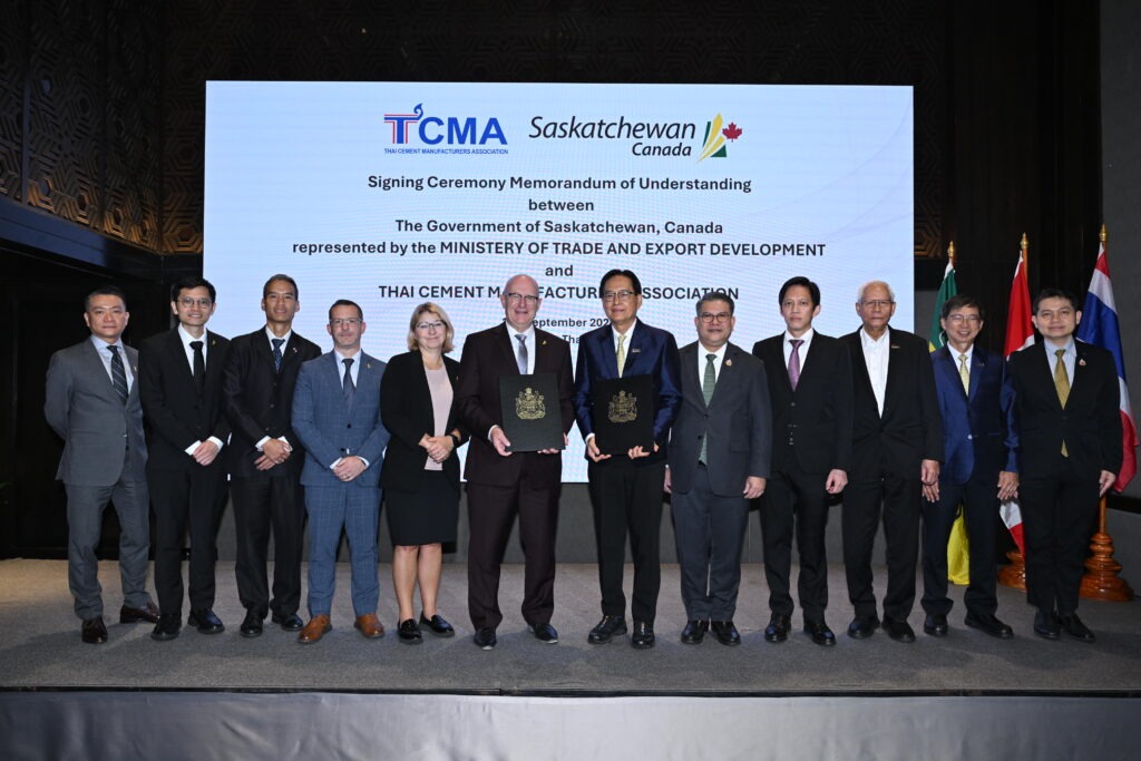 นายนภดล รมยะรูป อุปนายก สมาคมอุตสาหกรรมปูนซีเมนต์ไทย (TCMA) รักษาการนายก TCMA และ Hon. Warren Kaeding รัฐมนตรีว่าการกระทรวงการค้าและพัฒนาการส่งออก รัฐซัสแคตเชวัน ประเทศแคนาดา ลงนาม MOU แลกเปลี่ยนองค์ความรู้ ความเชี่ยวชาญ เร่งยกระดับผลักดันการใช้เทคโนโลยีขั้นสูงการดักจับ-ใช้ประโยชน์จากคาร์บอน และด้านพลังงานสะอาด นำอุตสาหกรรมปูนซีเมนต์สู่ Net Zero 2050 และสนับสนุนเป้าหมาย NDC 3.0 พร้อมตั้งเป้าแผนร่วมงานระยะยาว ปั้นโมเดลโครงการนำร่องในสระบุรี แซนด์บ็อกซ์ โดยมี นายปวิช เกศววงศ์ รองอธิบดีกรมการเปลี่ยนแปลงสภาพภูมิอากาศและสิ่งแวดล้อม และ นายปณตสรรค์ สูจยานนท์ รองอธิบดีกรมโรงงานอุตสาหกรรม ให้เกียรติเป็นสักขีพยาน ณ โรงแรม เจ ดับบลิว แมริออท กรุงเทพฯ