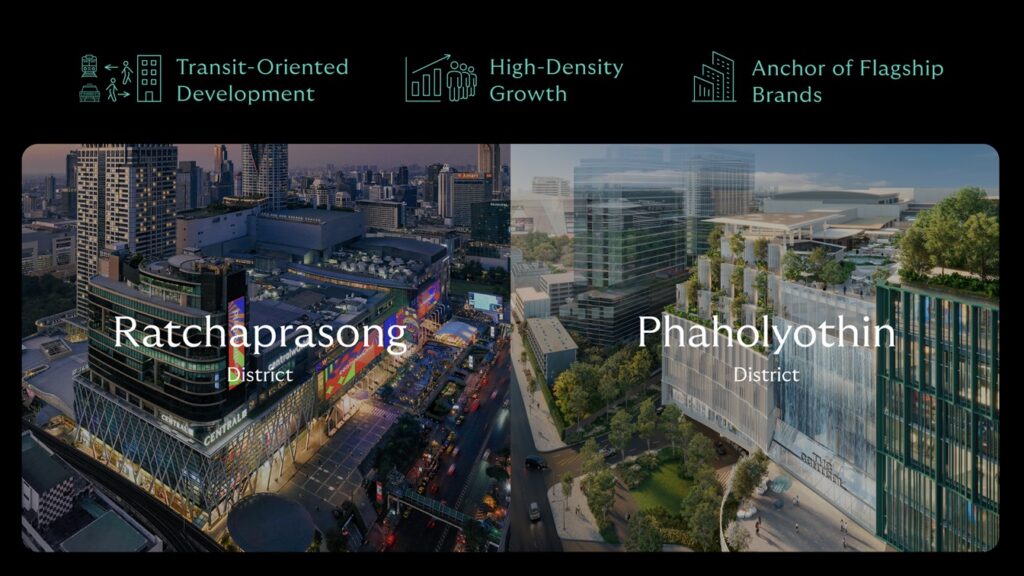 - พหลโยธินมีศักยภาพเทียบชั้นย่านราชประสงค์: ในฐานะย่านที่เป็นทำเลยุทธศาสตร์เหมาะกับการพัฒนาโครงการระดับ World-Class ได้แก่ 1) Transit-Oriented Development: เติบโตบนฐานโครงสร้างคมนาคมหลัก ทั้ง BTS, MRT และถนนสายสำคัญ เป็นจุดเชื่อมต่อการใช้ชีวิต–การทำงาน–การเดินทาง, 2) High-Density & Mixed Demand: รายล้อมด้วยดีมานด์คุณภาพสูง ทั้งที่อยู่อาศัยระดับกลาง–บน อาคารสำนักงาน โรงแรม และสถาบันการศึกษา และ 3) Anchor of Flagship Brands: เช่นเดียวกับที่ centralwOrld เป็น ‘Flagship Landmark’ ของราชประสงค์ ดังนั้น The Central พหลโยธิน จะเป็น ‘The Landmark of Northern Bangkok’ ที่ขับเคลื่อนการเติบโตของย่าน