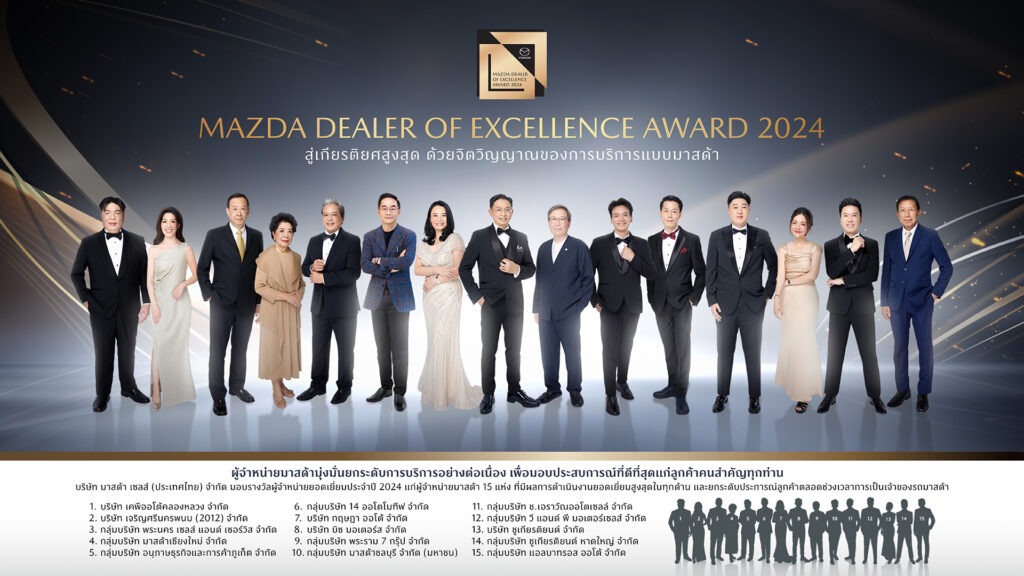 มาสด้าจัดงาน Mazda Dealer of Excellence Awards 2024 เพื่อเชิดชูความสำเร็จของผู้จำหน่ายที่มีผลการดำเนินงานยอดเยี่ยมตลอดปี 2567 ภายใต้ธีม “Driven to Distinction ขับเคลื่อนสู่ความเป็นหนึ่ง ด้วยความแตกต่างเหนือระดับ” ถ่ายทอดความเป็นเลิศอันเกิดจากการร่วมแรงร่วมใจเป็นหนึ่งเดียวกัน ตั้งมั่นด้วยปณิธานอันแน่วแน่คือการส่งมอบประสบการณ์ที่ดีที่สุดให้กับลูกค้า พร้อมมอบรางวัลทีมงานฝ่ายขายและฝ่ายบริการยอดเยี่ยมแห่งปี หรือ Mazda Guild Sales and Servies Awards 2024 ให้กับทีมงานของผู้จำหน่ายที่มีผลการดำเนินงานดีที่สุดตลอดปีที่ผ่านมา เพื่อสร้างขวัญกำลังใจ และแทนคำขอบคุณที่เป็นกำลังสำคัญในการขับเคลื่อนธุรกิจ ด้วยการส่งมอบการบริการที่เป็นเลิศให้กับลูกค้ามาสด้าในประเทศไทย โดยงานฯ จัดขึ้นที่โรงแรม โฟร์ซีซั่นส์ ริมแม่น้ำเจ้าพระยา กรุงเทพฯ เมื่อเร็ว ๆ นี้ โดยมีผู้บริหารจากมาสด้า เซลส์ ประเทศไทย ผู้จำหน่ายมาสด้าทั่วประเทศ และทีมงานของผู้จำหน่ายเข้าร่วมงาน เพื่อร่วมแสดงความยินดี ภายใต้บรรยากาศที่เต็มไปด้วยความอบอุ่นและเป็นกันเอง
