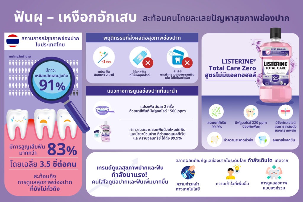 จากรายงานสุขภาพช่องปากแห่งชาติ ครั้งที่ 9 โดยสำนักทันตสาธารณสุข กรมอนามัย ปี 2566 เผยว่า คนไทยวัยทำงานมีภาวะเหงือกอักเสบสูงถึง 81% และกว่า 83% มีการสูญเสียฟัน โดยเฉลี่ย 3.5 ซี่ต่อคน สะท้อนปัญหาสุขภาพช่องปากที่ยังไม่ได้รับการดูแลอย่างทั่วถึง สถานการณ์ในประเทศไทยนั้นสอดคล้องกับระดับโลก ที่พบว่าประชากรเกือบครึ่งหนึ่งมีปัญหาสุขภาพช่องปากที่ไม่ได้รับการรักษา โดยเฉพาะฟันผุในเด็กและวัยรุ่น รวมถึงโรคเหงือกอักเสบในผู้ใหญ่ที่เกิดจากคราบจุลินทรีย์สะสม