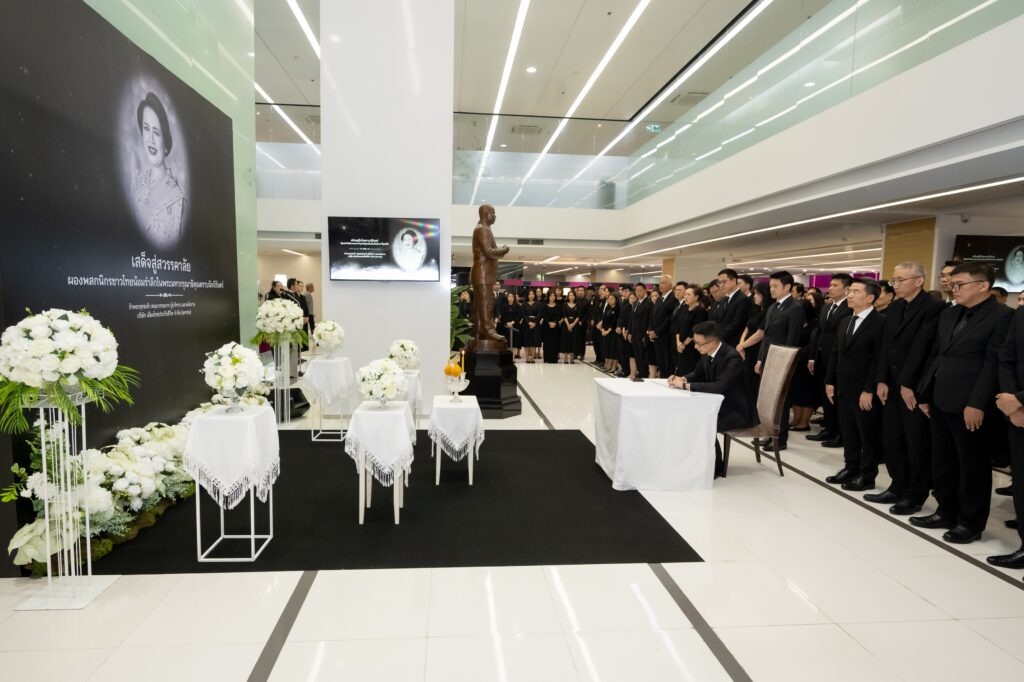 ในโอกาสนี้ นายสาระ ล่ำซำ ประธานเจ้าหน้าที่บริหาร ได้กล่าวถวายความอาลัย พร้อมกันนี้ คณะผู้บริหารและพนักงาน ได้พร้อมใจกันยืนสงบนิ่ง และลงนามในสมุดถวายความอาลัย เพื่อแสดงความจงรักภักดี และน้อมรำลึกถึงพระมหากรุณาธิคุณที่ทรงมีต่อพสกนิกรชาวไทย ตลอดระยะเวลาที่ทรงปฏิบัติ พระราชกรณียกิจน้อยใหญ่นานัปการ ตามที่ทรงตั้งพระราชปณิธานอย่างแน่วแน่ ในการบำเพ็ญ พระราชกรณียกิจมาตลอดพระชนม์ชีพ เพื่อบำบัดทุกข์บำรุงสุข แก่พสกนิกรชาวไทยในทุกหนแห่ง อีกทั้ง ยังทรงส่งเสริมงานด้านศิลปวัฒนธรรม หัตถศิลป์ไทย ตลอดจนการอนุรักษ์ธรรมชาติและสิ่งแวดล้อม รวมทั้งการพัฒนาคุณภาพชีวิตของประชาชนในถิ่นทุรกันดาร ซึ่งสะท้อนถึงพระเมตตาของ สมเด็จพระนางเจ้าสิริกิติ์ พระบรมราชินีนาถ พระบรมราชชนนีพันปีหลวง สมดังพระราชสมัญญา “พระแม่ของแผ่นดิน”