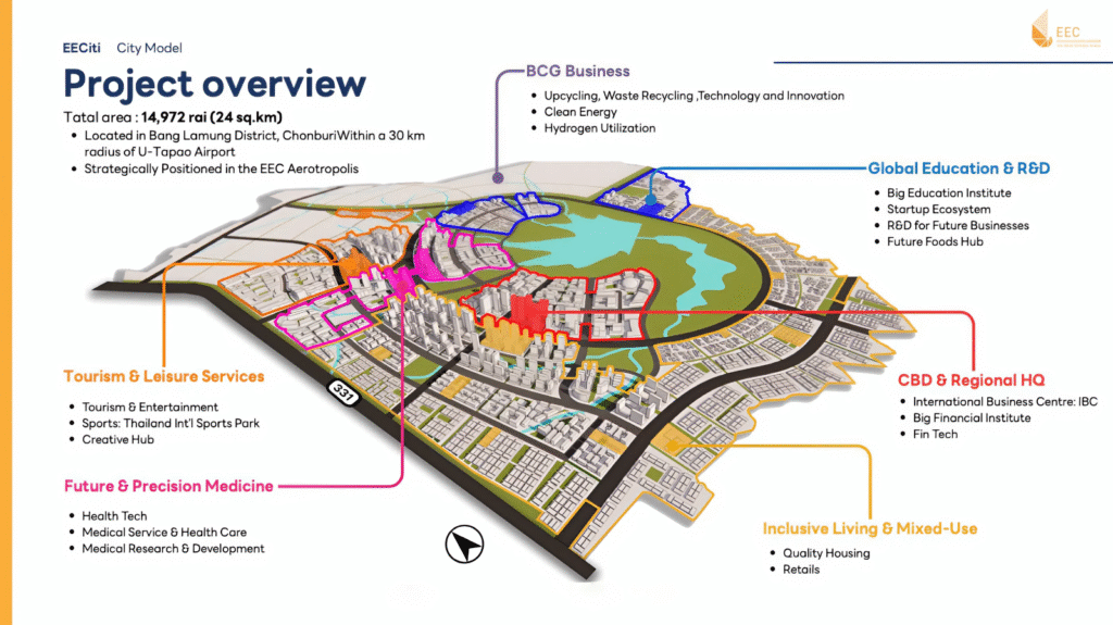 โดยปัจจุบันกำลังอยู่ในขั้นตอนของการออกแบบ Conceptual drawing และศึกษารายละเอียดความเป็นไปได้ทางการเงินและการลงทุน เพื่อเตรียมประกาศเชิญชวนลงทุน PPP โดยแผนผังการใช้ประโยชน์ที่ดินและแบบเชิงแนวคิดของโครงการ EECiti ได้รับการออกแบบด้วยแนวคิด Smart – Green – Livable – Inclusive เป็นเมืองอัจฉริยะที่เป็นมิตรต่อสิ่งแวดล้อม อยู่ได้จริงสำหรับทุกคน รวมถึงจะเป็นประโยชน์สำหรับประชากรปัจจุบันที่อาศัยอยู่ที่ ตำบลห้วยใหญ่ อำเภอบางละมุง จังหวัดชลบุรี ซึ่งเป็นที่ตั้งของโครงการ สอดคล้องกับยุทธศาสตร์ชาติ และเป้าหมายการพัฒนาอย่างยั่งยืน หรือ SDGs รวมทั้งรับกับเทรนด์โลกและความต้องการของตลาด โดยแบ่งเป็น 6 โซนพื้นที่คลัสเตอร์ธุรกิจหลักภายในโครงการฯ ได้แก่