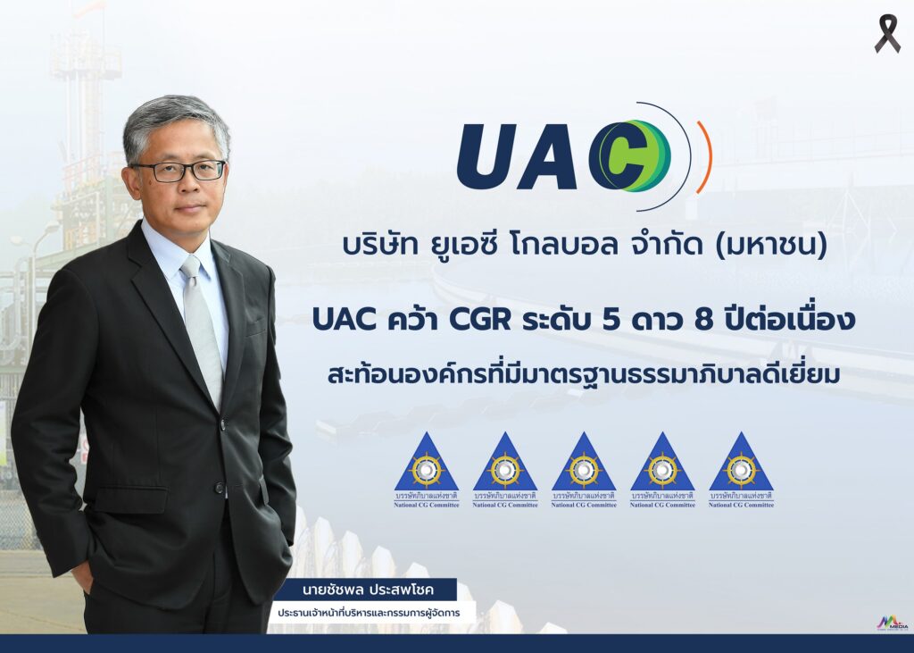 บริษัท ยูเอซี โกลบอล จำกัด (มหาชน) หรือ “UAC” ได้รับคะแนนการประเมินการกำกับดูแลกิจการในระดับ 5 ดาว หรือ “ดีเลิศ” (Excellent CG Scoring) ต่อเนื่องเป็นปีที่ 8 สะท้อนความตั้งใจในการกำกับดูแลกิจการที่ดี มีความโปร่งใส ปฏิบัติต่อผู้มีส่วนได้เสียอย่างเท่าเทียมกัน สู่การสร้างความเชื่อมั่นและผลตอบแทนที่ดีแก่ผู้ลงทุนอย่างต่อเนื่อง